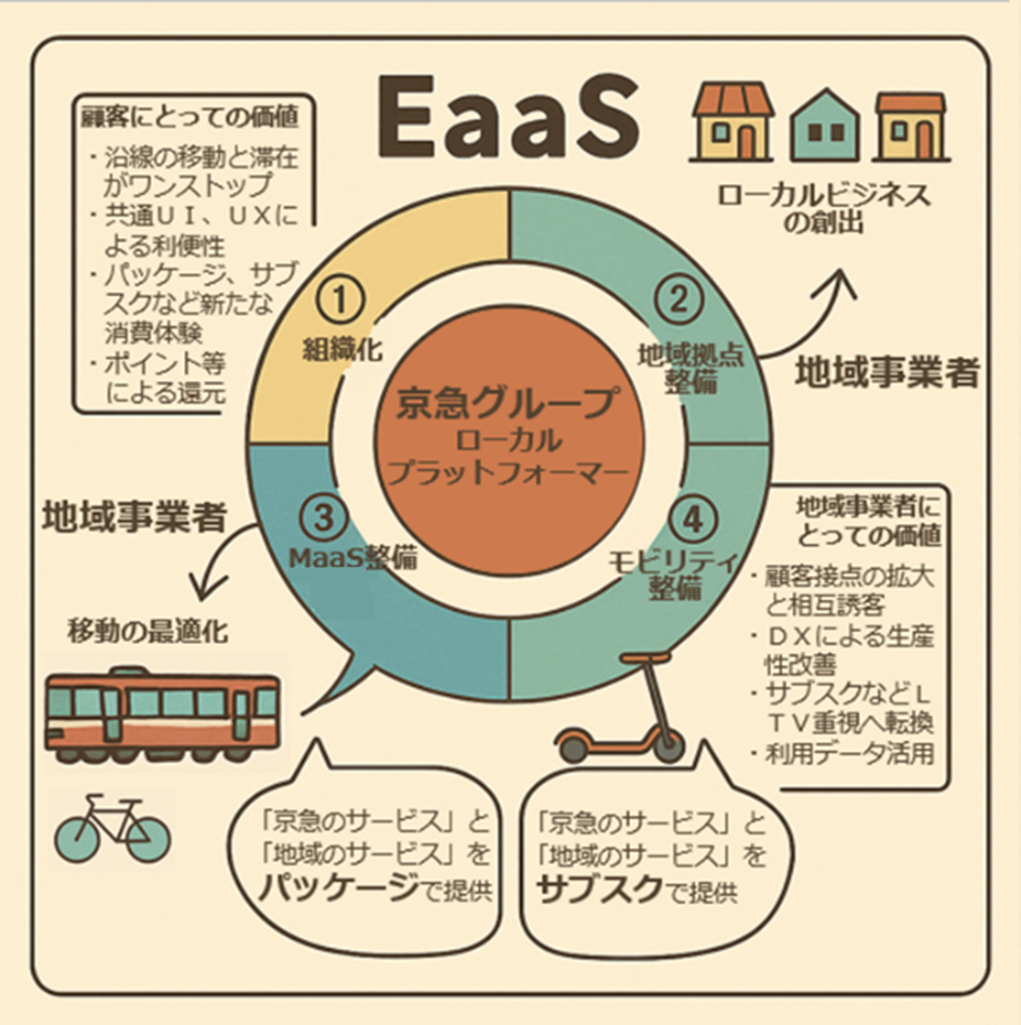 京急グループ総合経営計画「沿線価値共創戦略」において重視する,地域との連携を具体化する4つの共創活動の「組織化」「地域拠点整備」「MaaS 整備」「モビリティ整備」の推進を通じた将来像として,デジタル基盤とともに沿線地域が一体となったサービス「EaaS(ENSEN as a Service)」の構築を目指します。