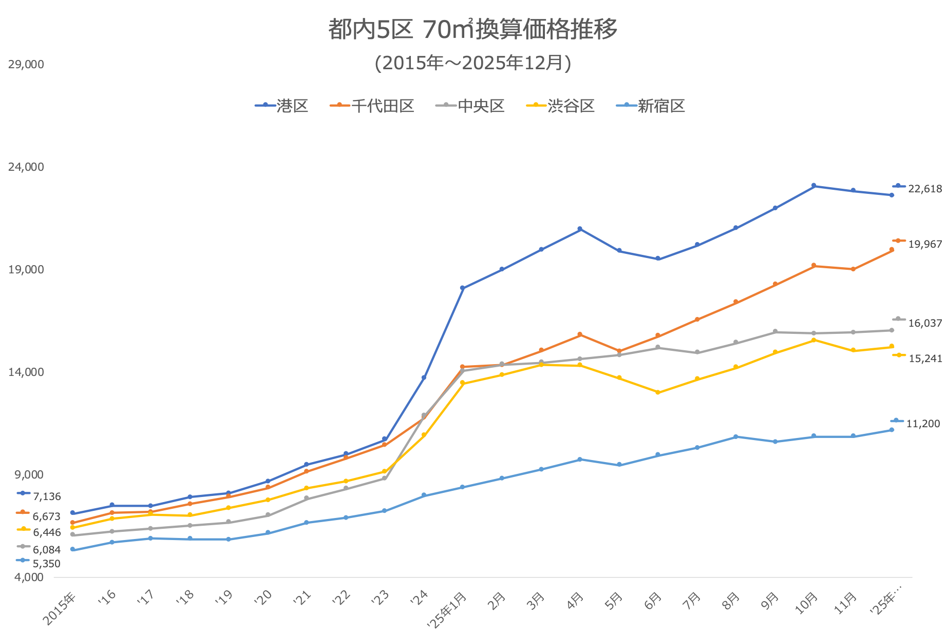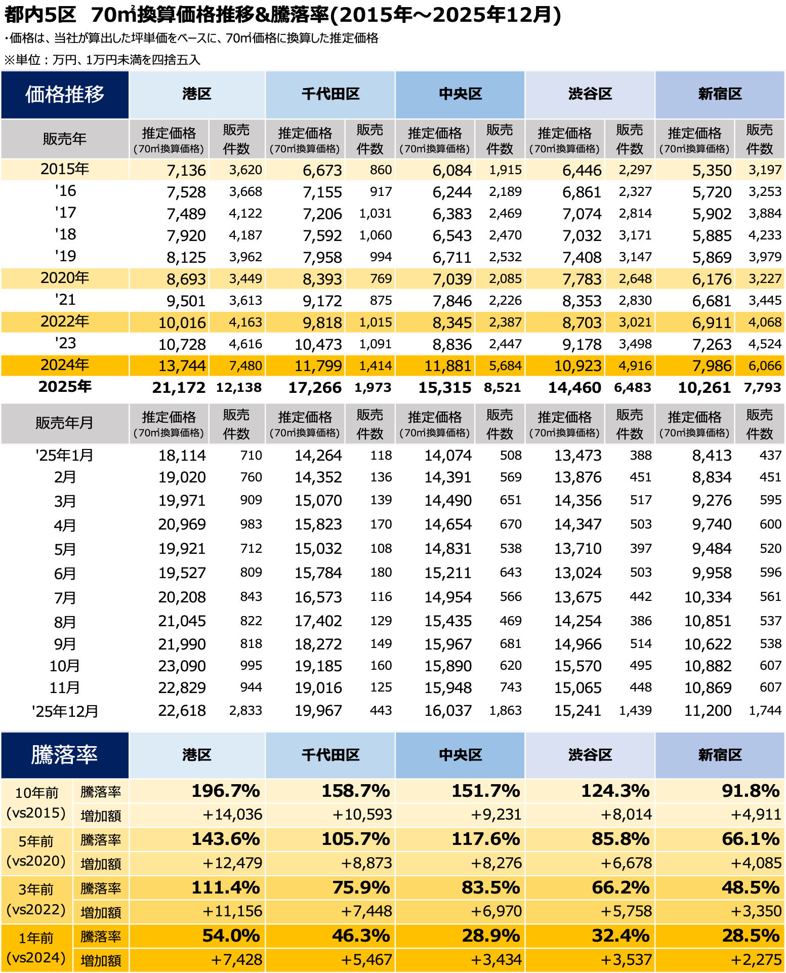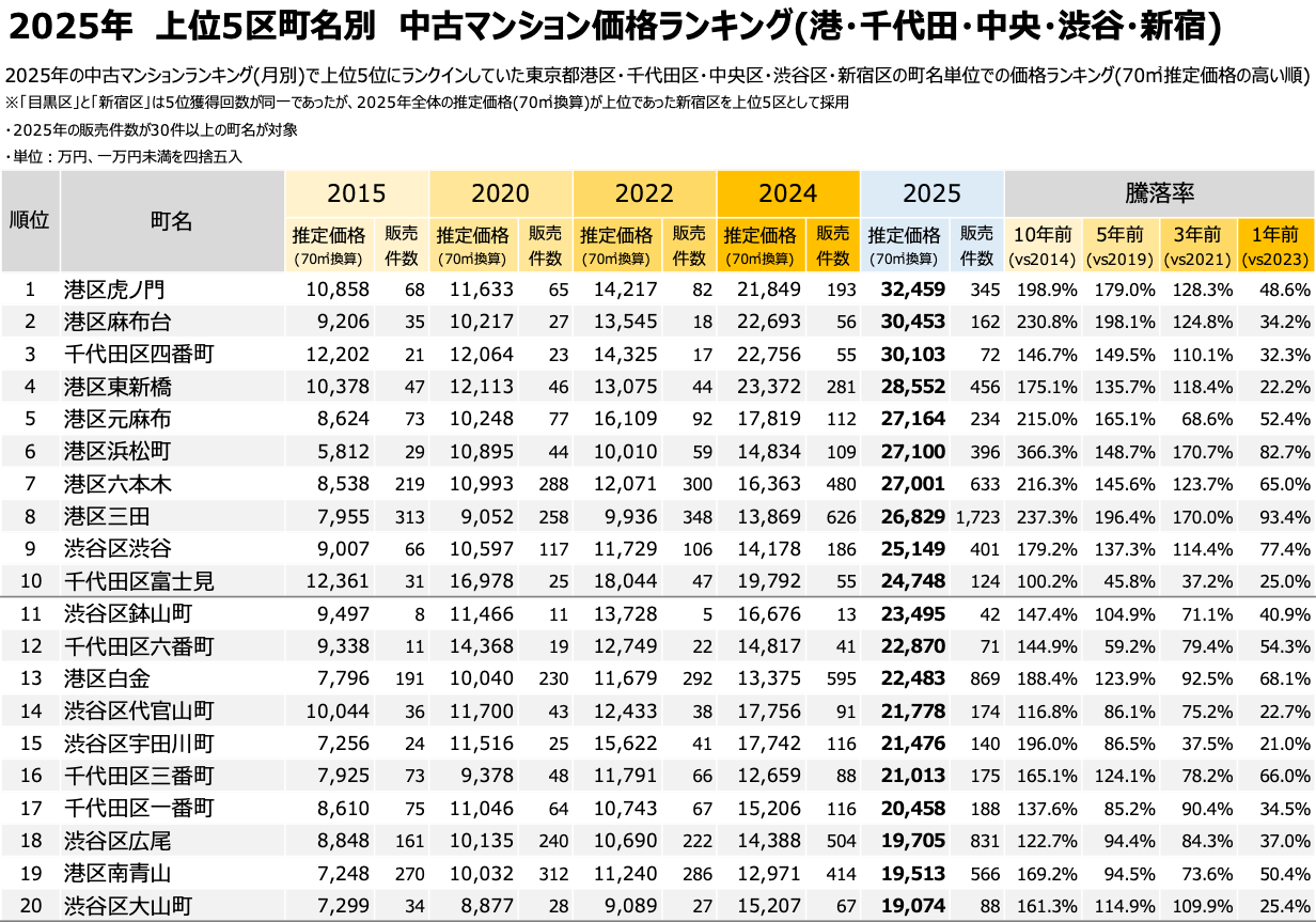 その第1弾として、2025年中古マンション価格ランキングにおいて、年間を通じて上位5位であった東京都港区・千代田区・中央区・渋谷区・新宿区区の5区について深掘りし、10・5・3・1年前からの推移と町名単位での中古マンション価格推移を発表いたします。