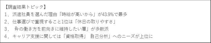 【派遣社員の仕事観やキャリアに対する意識調査】は、今回で4回目の実施となります。今回の調査では、「無理なく長く働き続けたい」と回答した人が半数を超えるなど、派遣という働き方を前向きに捉え、継続を希望する傾向が見られました。また、仕事選びでは「休日のとりやすさ」や「働く環境の快適さ」「福利厚生・手当」など、生活との両立や日常的な働きやすさを重視する意識が引き続き高い結果となっています。さらに、利用してみたい支援サービスとしては、「資格取得スクール」や「自己分析・適職診断」など、将来に向けたスキル向上や自己理解を求める声が多く寄せられました。