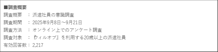株式会社ウィルオブ・ワーク(本社:東京都新宿区、代表取締役社長:村上 秀夫)は、当社が運営する総合人材サービス『ウィルオブ』を利用する20歳以上の派遣社員を対象に、現状のサービスや働き方に関するアンケート調査を実施しました。(調査期間:2025年9月8日~9月21日、回答数:2,217名)本調査は、前回調査※の2025年3月に引き続き4回目の実施となります。