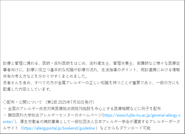 本手引きは、わが国で初めて、金属アレルギーの診療・管理に関し、エビデンスと専門家の合意に基づいて得られた統一見解から作成されたものです。本手引きの普及により、わが国において早急に対策を講ずる必要のある金属アレルギーに対し、安全で質の高い診療・治療方法の均てん化を図ることをめざしています。
