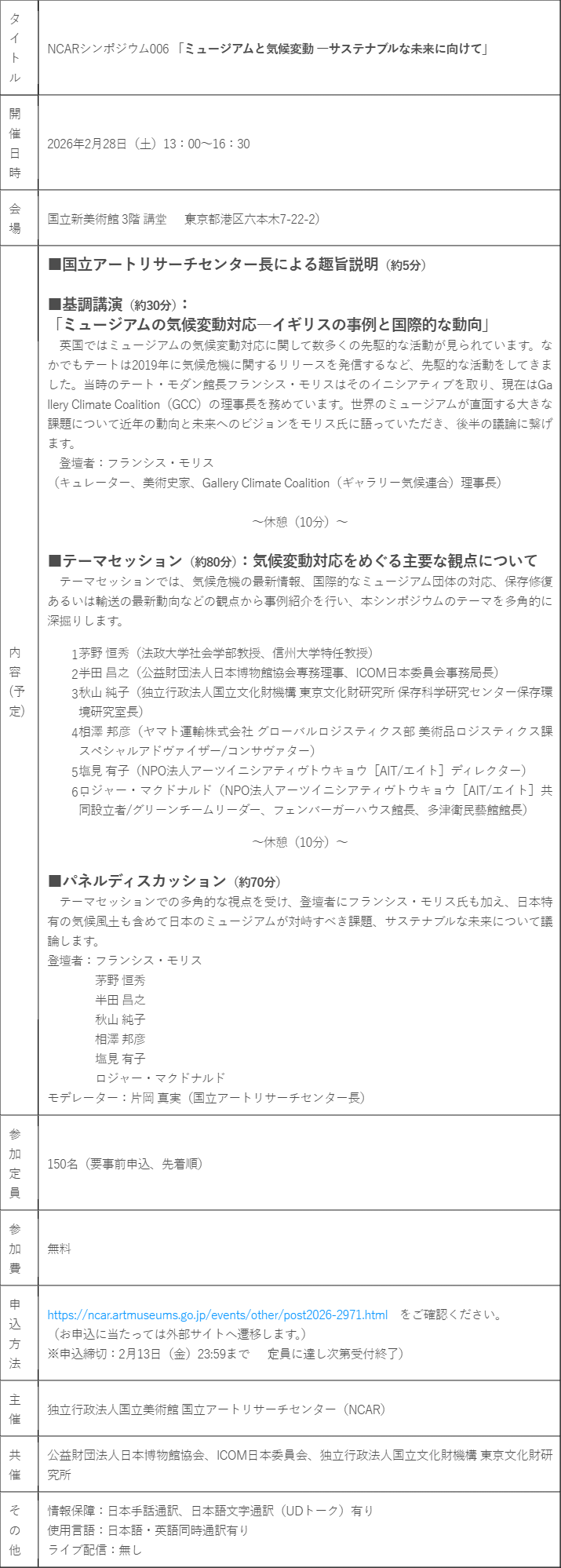 国立アートリサーチセンター(略称:NCAR、センター長:片岡真実)は、2026年2月28日(土)に「NCARシンポジウム006『ミュージアムと気候変動 ―サステナブルな未来に向けて』」を国立新美術館 3階 講堂にて開催します。本シンポジウムでは、ミュージアム(美術館、博物館)と気候変動に関する国際的な動向や事例研究から学び、社会学、ミュージアム運営、文化財の保存科学、美術作品の輸送・保存などの専門家とともに、さまざまな角度から考え、我が国のミュージアムが気候変動に関して抱える課題や実態について検証しながら、意識喚起と具体的なアクションに向けた議論を深めます。