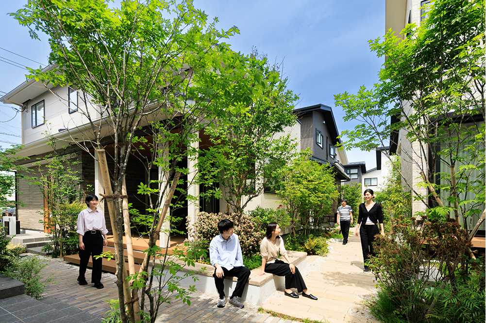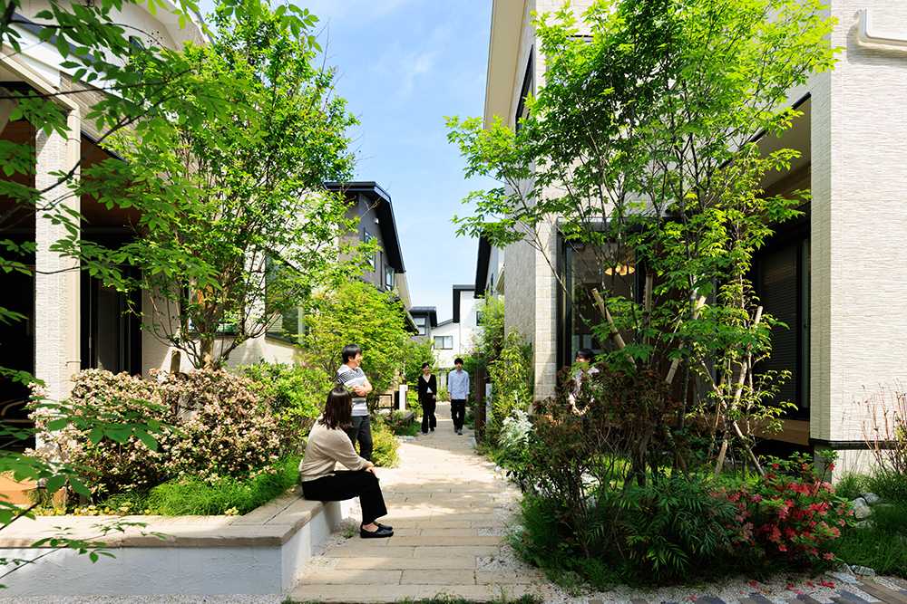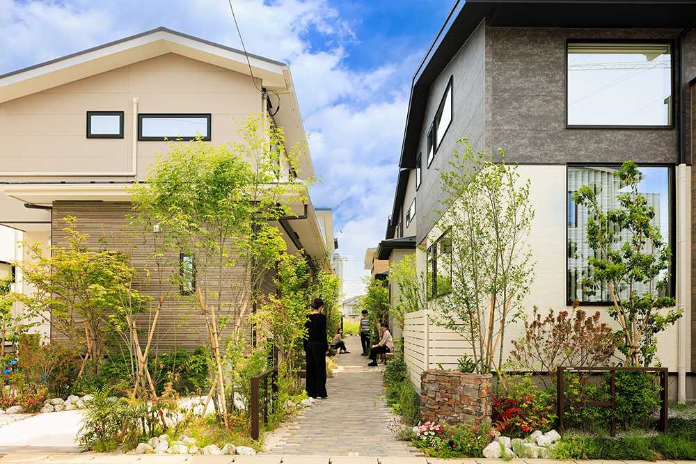三方を道路に囲まれた全15棟の分譲住宅です。地役権を設定した共用の敷地に、通行路である小路(フットパス)ではなく、「滞在する行為」を促す小路「ステイパス」(Stay:滞在する、Path:小路)を計画しました。建物内と外を緩やかにつなぐことで、住民同士の持続可能なコミュニティ形成、緑の街並み景観、歩車分離による安全安心を実現し、心地よい住環境を創出しています。
