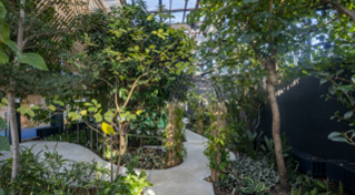 ●亜熱帯植物が楽しめるガラス張りの植物園には、2社の源となるさつまいもとコーヒーノキも植栽。