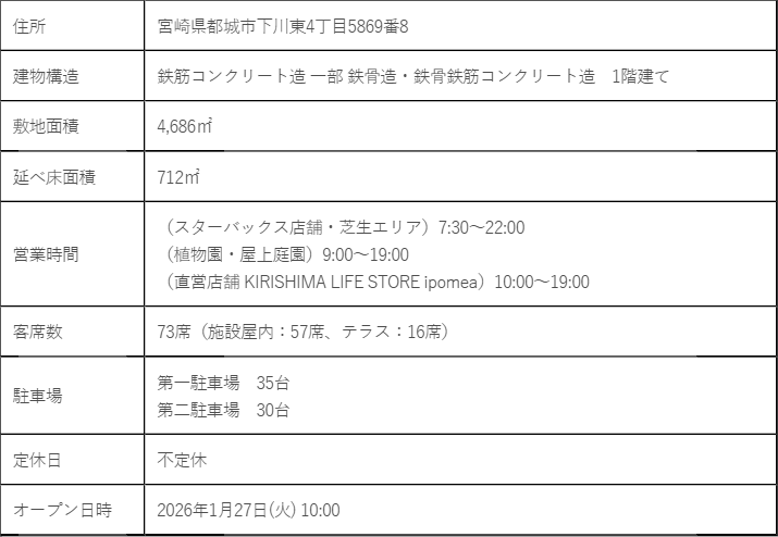 霧島酒造株式会社[本社:宮崎県都城市、代表取締役社長:江夏邦威]と、スターバックス コーヒー ジャパン 株式会社[本社:東京都品川区、代表取締役最高経営責任者(CEO):森井久恵]は、都城の豊かな自然を楽しみ、人々が集い、憩う施設、「KIRISHIMA GREENSHIP icoia(キリシマ グリーンシップ イコイア)」を2026年1月27日 (火)に開業いたします。