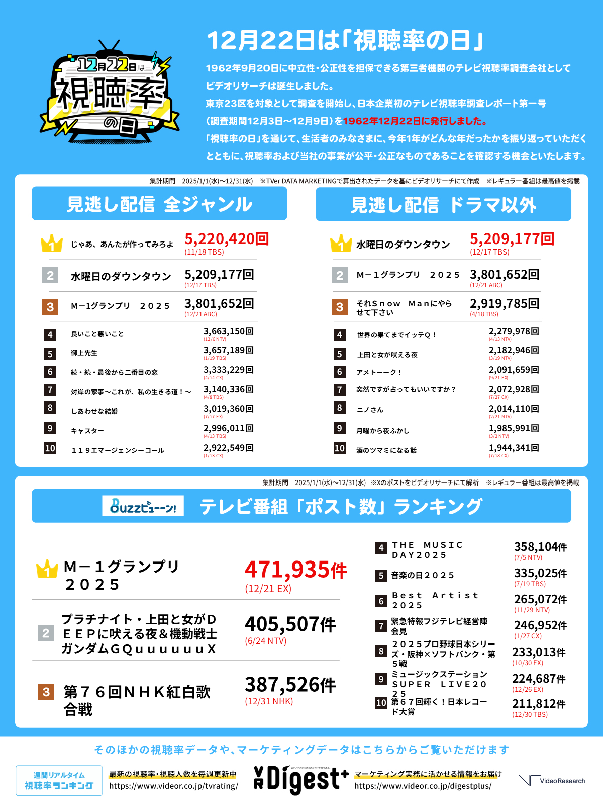 <ビデオリサーチ調べ「2025年テレビ視聴率総まとめ」>掲載内容