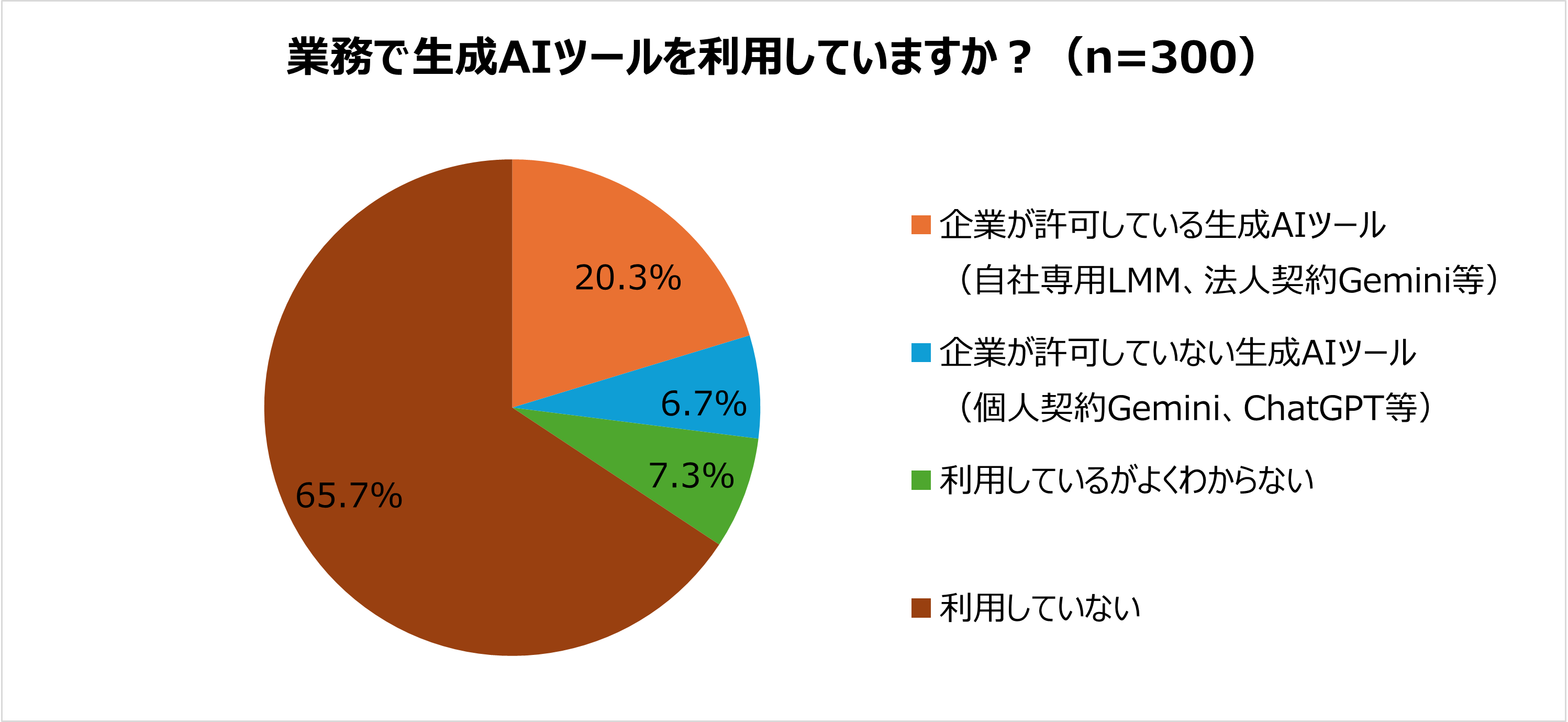 内訳をみると、「企業が許可していない生成AIツール(個人契約Gemini、ChatGPT等)」の利用者も20人おり、生成AIツール利用者の少なくとも約5人に1人が「シャドーAI」という結果となりました。