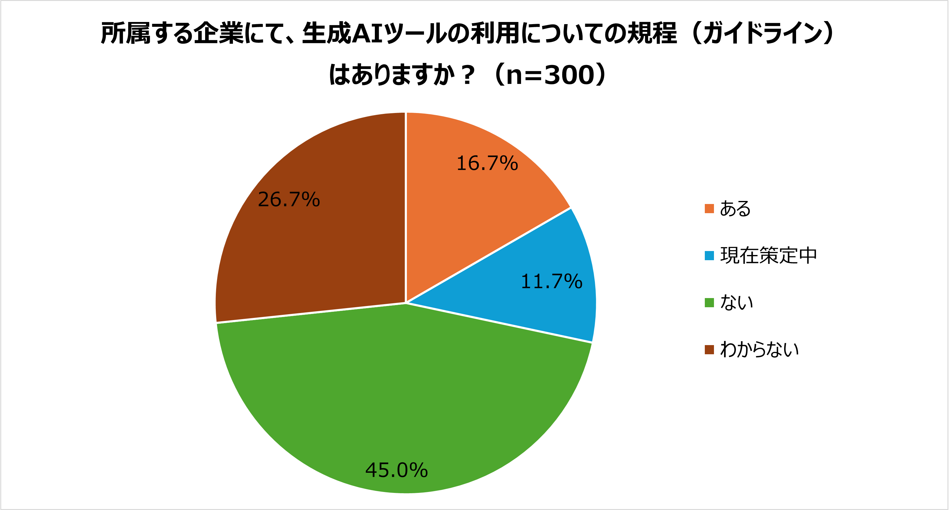 「所属する企業にて、生成AIツールの利用についての規程(ガイドライン)はありますか?」という質問に対して「ない」と回答した人は45%、「ある」「現在策定中」と回答した人は合計28.4%でした。また、「わからない」という回答も26.7%に上り、約4人に1人が生成AI利用に関する社内規程を把握していないという結果になりました。