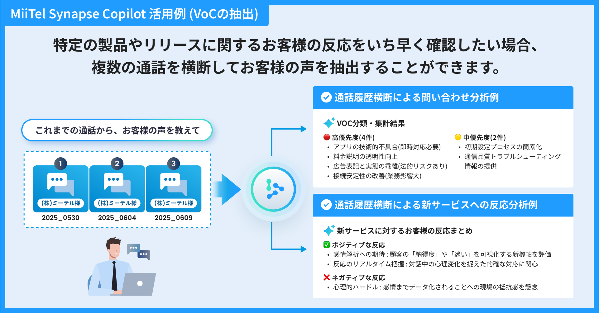 VoC(顧客の声)の即時収集・分析:新製品の発売後やキャンペーン実施時など、特定のテーマに関するお客様の反応を複数の通話から一括抽出。市場のフィードバックをどこよりも早く経営やプロダクト開発に活かせます。
