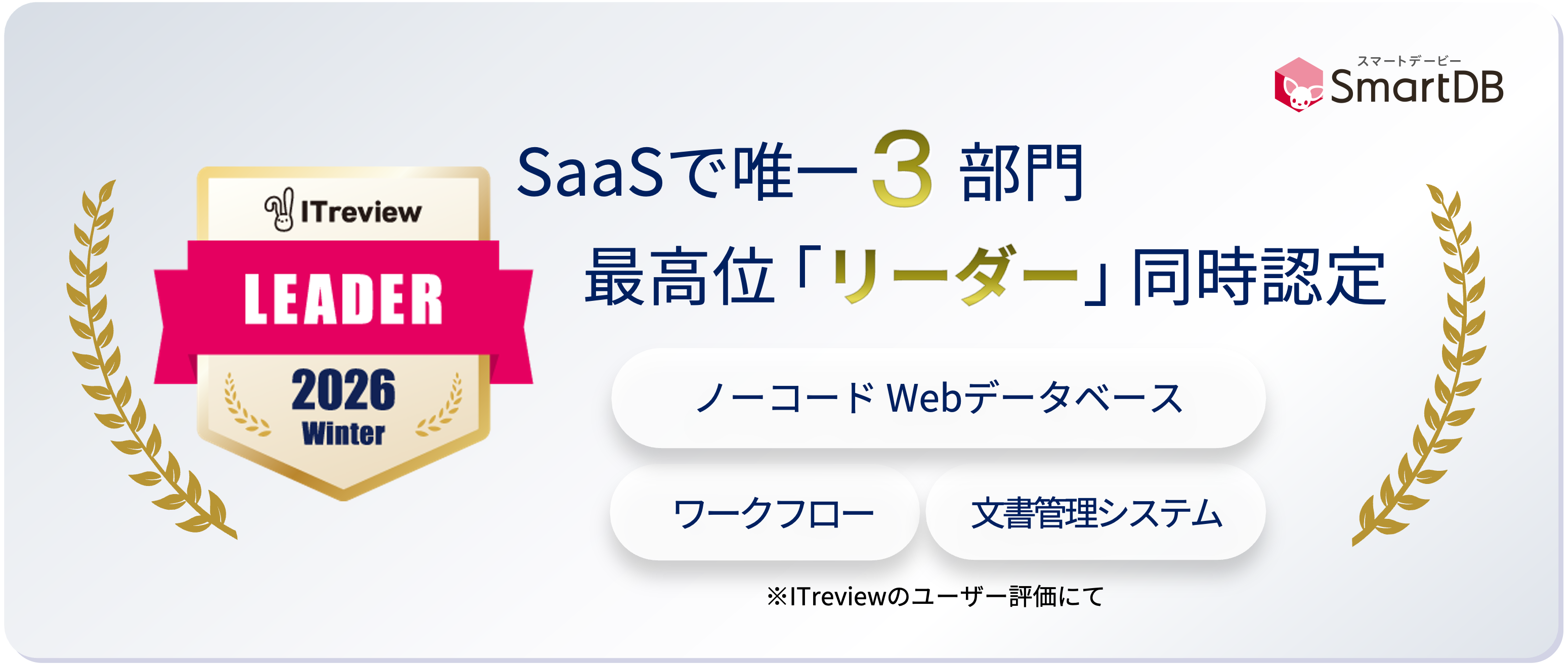 SmartDB(R)は、業務デジタル化にあたって重要な要素である「ノーコードWebデータベース(※1)」、「ワークフローシステム(※2)」、「文書管理システム(※3)」の3部門においてSaaSで唯一、最高位の「Leader」に同時認定されました。 なお、SmartDB(R)の「ITreview Grid Award」受賞は21期連続、3部門同時は15期連続となります。
