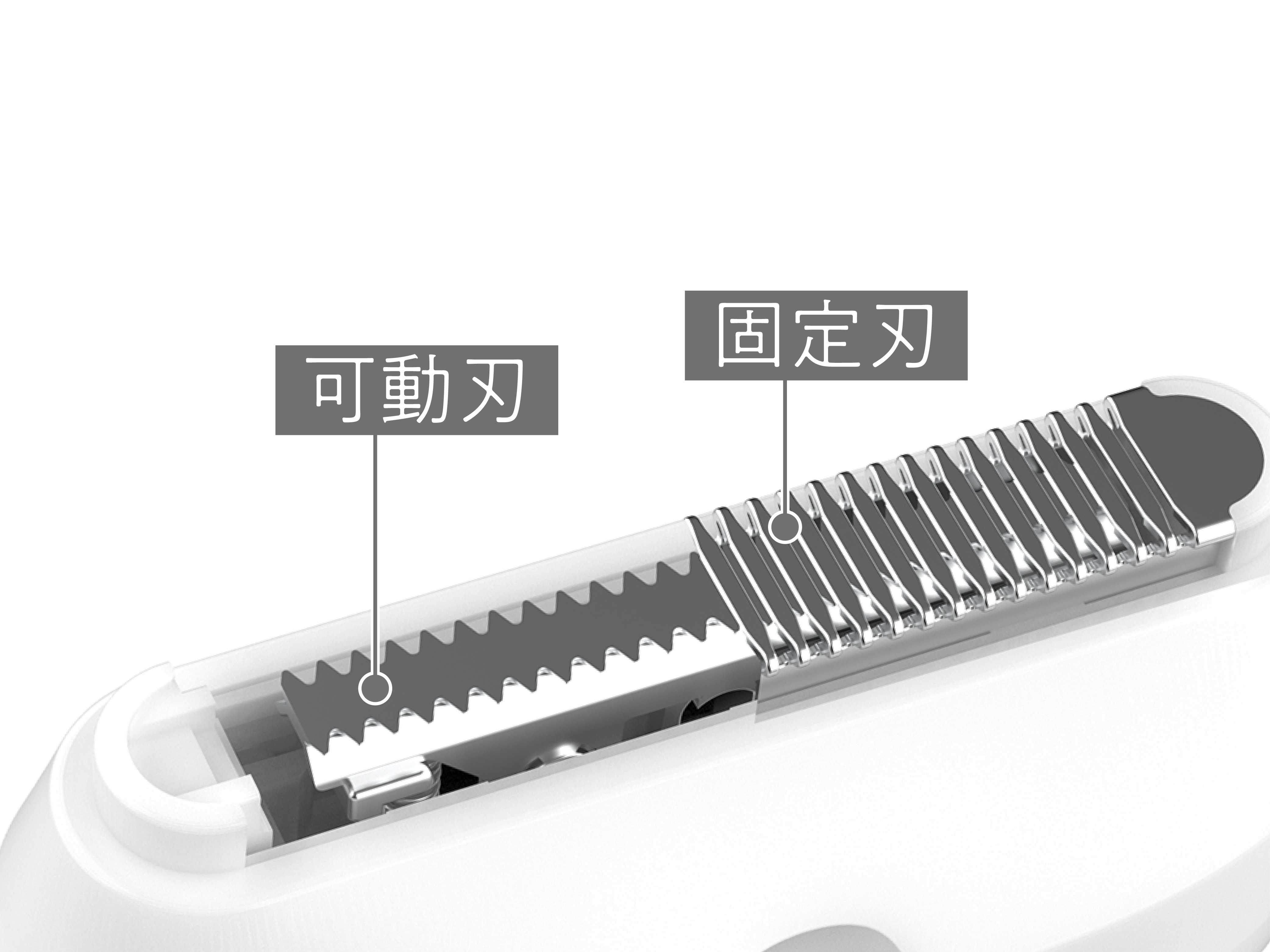 可動刃は固定刃の下にあるため、刃が直接肌に触れず、やさしいカットが可能