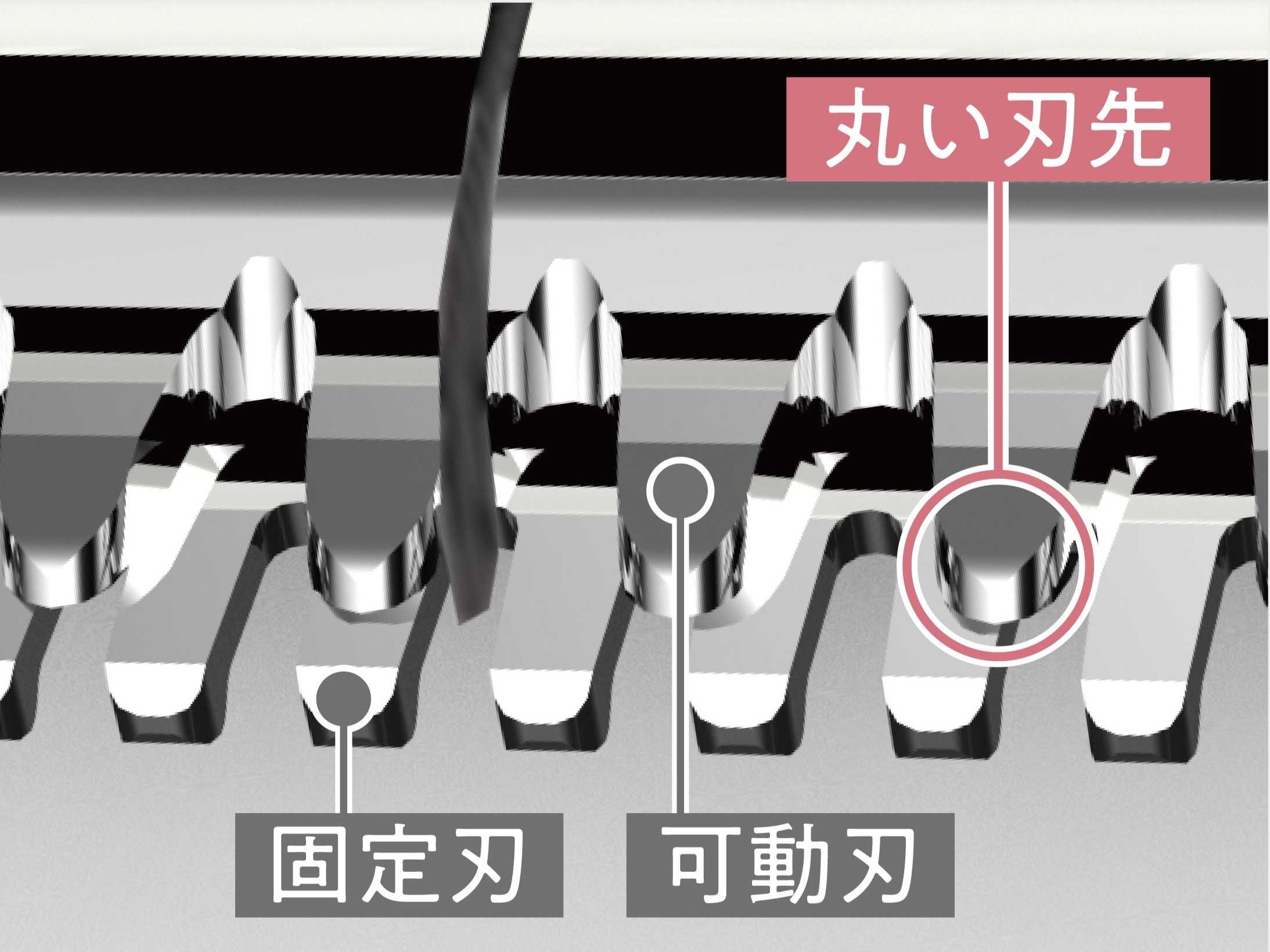 肌を傷つけにくい丸い刃先、刃の間隔を狭めたことで刃と肌の距離が近く、肌を巻き込みにくい