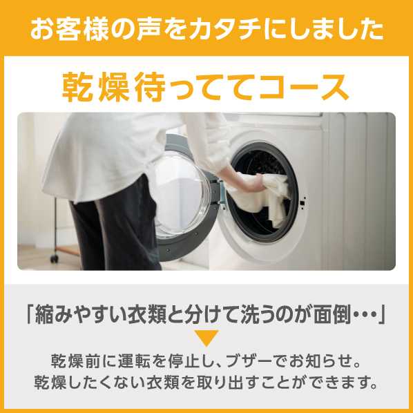 また、「乾燥機能は便利だけど、縮みやすい衣類と分けて洗うのが面倒」といったお客様のご意見を元にした、「乾燥待ってて」コースを搭載しました。洗濯(脱水)終了後にブザーでお知らせし、乾燥運転に入る前に一度停止することで、乾燥したくないデリケートな衣類だけを取り出し、残りの洗濯物だけを乾燥させることが可能です。
