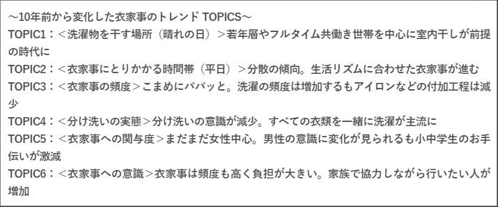 TOPIC6:<衣家事への意識>衣家事は頻度も高く負担が大きい。家族で協力しながら行いたい人が増加