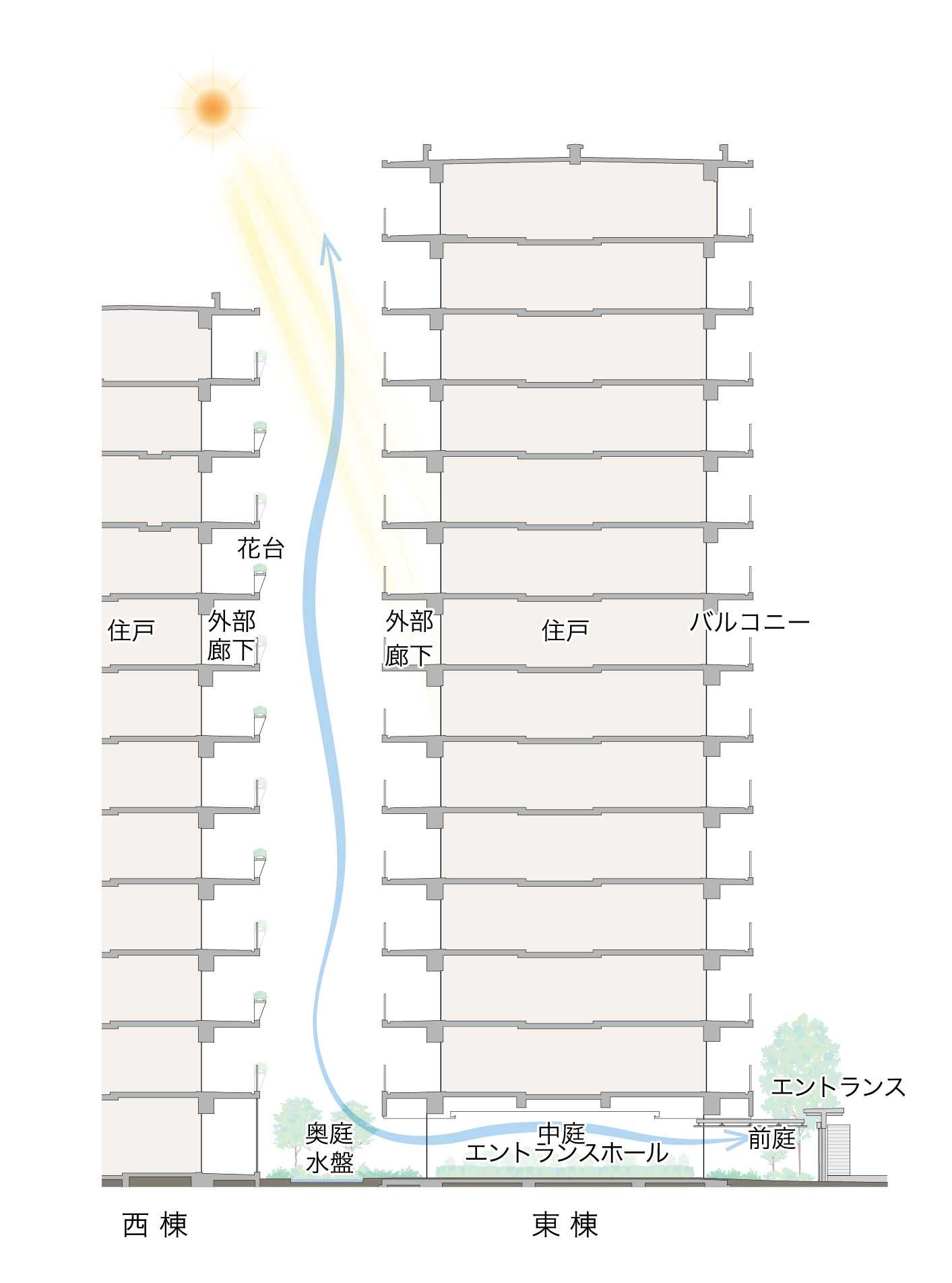 自然光や通風を効果的に取り入れる立体的な建築構成とし、共用部には植栽や水景を取り入れた空間を計画しました。外部から敷地内へと連続する緑のアプローチや、東棟1階には中庭的な共用スペースを設けることで、日常の動線の中で自然を身近に感じられる住環境を創出しています。また、外観デザインには木調や自然素材を想起させる色合いを採用し、御殿町の落ち着いた住宅地の街並みと調和する佇まいを形成。敷地内の植栽計画も含め、時間の経過とともに街に馴染んでいく建築・ランドスケープを目指しました。