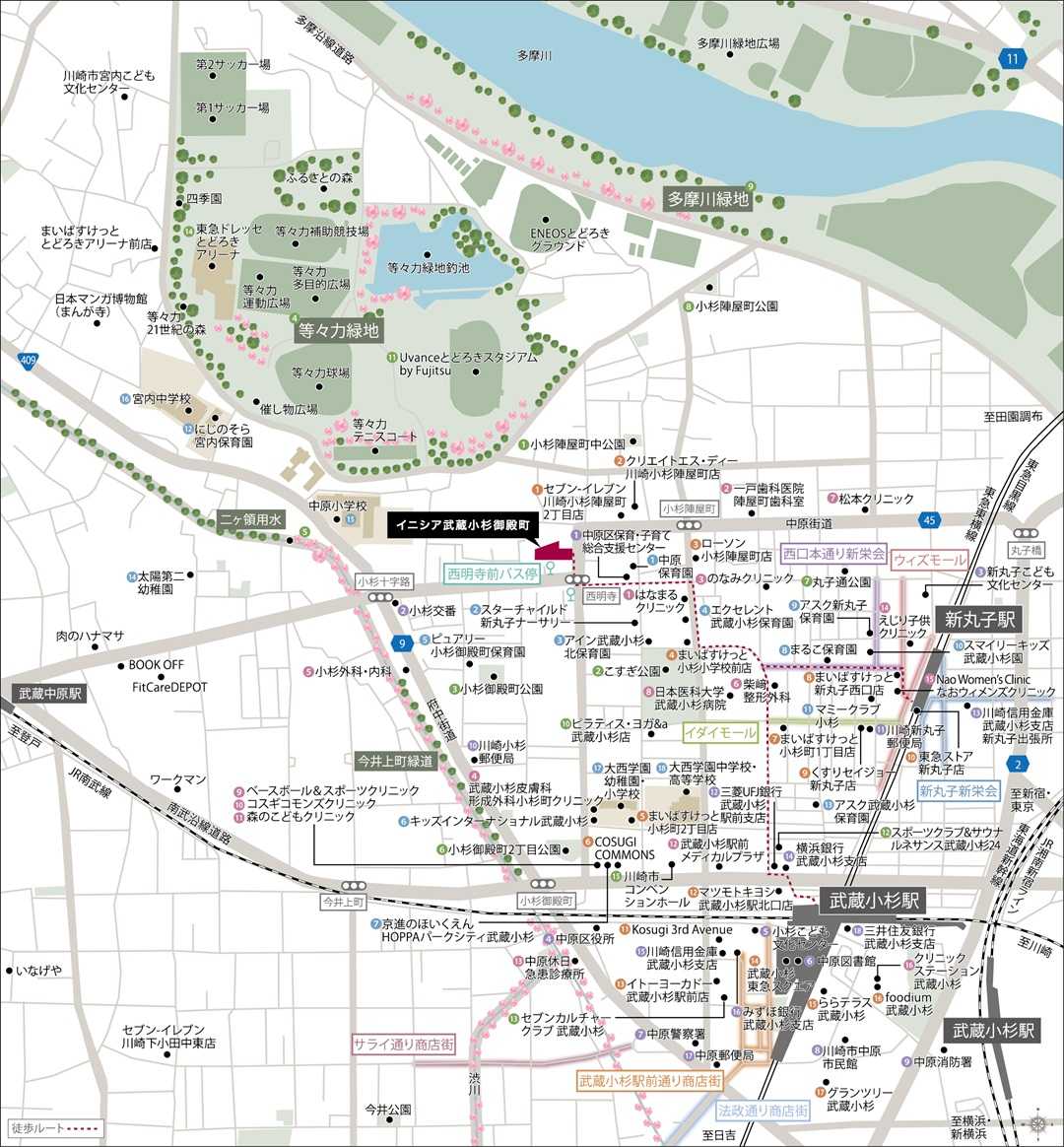 『イニシア武蔵小杉御殿町』は、JR南武線・横須賀線・湘南新宿ライン「武蔵小杉」駅徒歩13分、東急東横線・目黒線「新丸子」駅徒歩11分に位置し、周辺は、「グランツリー武蔵小杉」などの大型商業施設や、昔ながらの青果店や精肉店が並ぶ商店街など利便性の高い立地です。