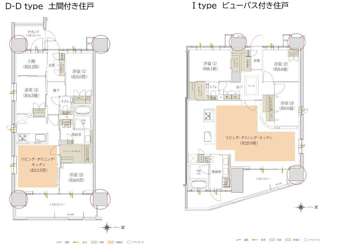 東西2棟構成により、2LDK~3LDK(55.16㎡~98.25㎡)の全10タイプの個性豊かなプランバリエーションと、8種のインテリアセレクト(ホームデコレーションサービス※2)を無償でご用意。土間付き住戸やビューバス付住戸など、多様な暮らしに対応。ライフスタイルに沿った住まいを選択可能です。