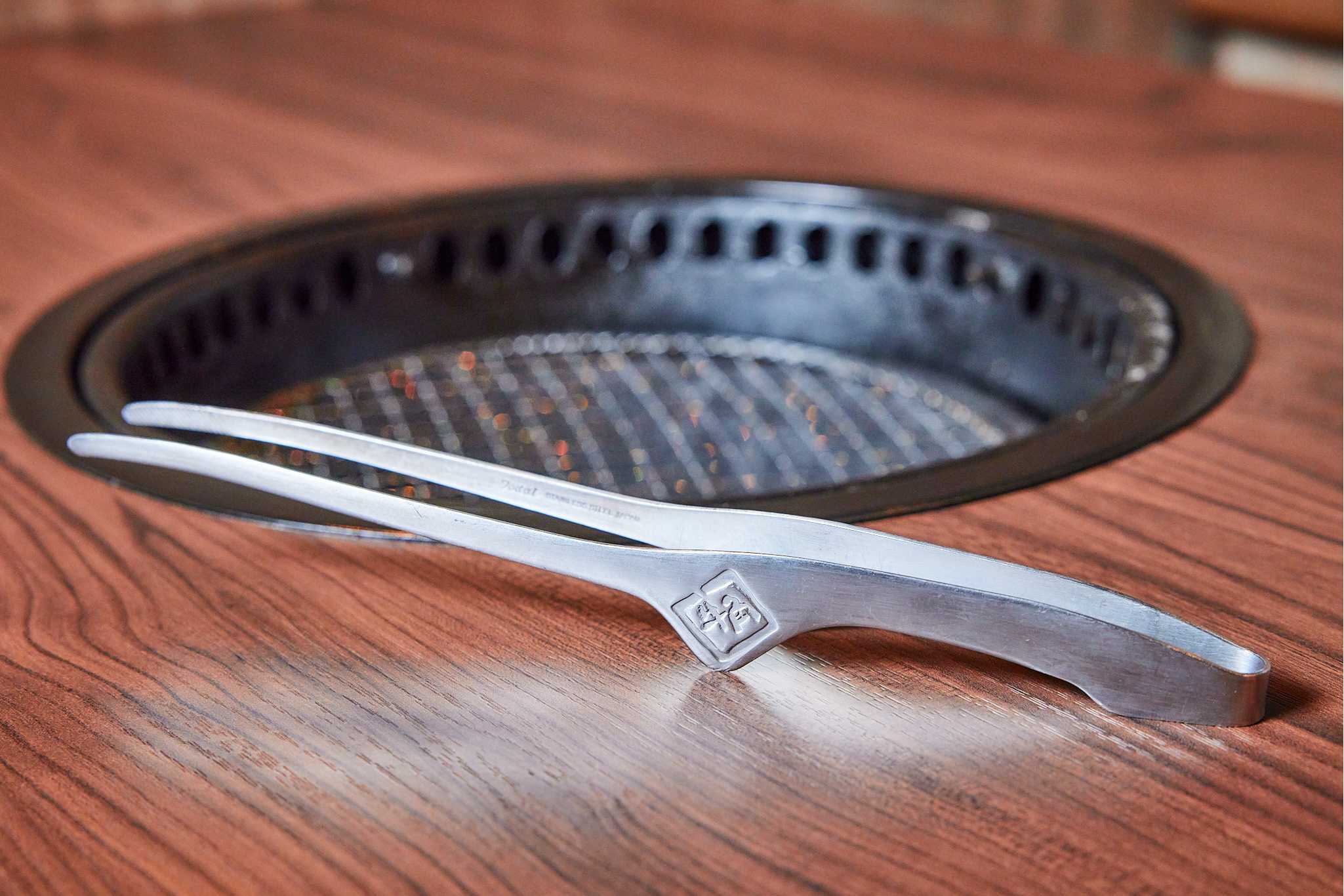牛角ならではの工夫を凝らした「牛角トング」は、焼肉店とし ての使いやすさを追求したオリジナル品です。 肉を挟む部分がテーブルに触れない構造で、衛生面にも配 慮。独自の“くびれ形状”により、食材をしっかりと掴みやすい のが特長です。
