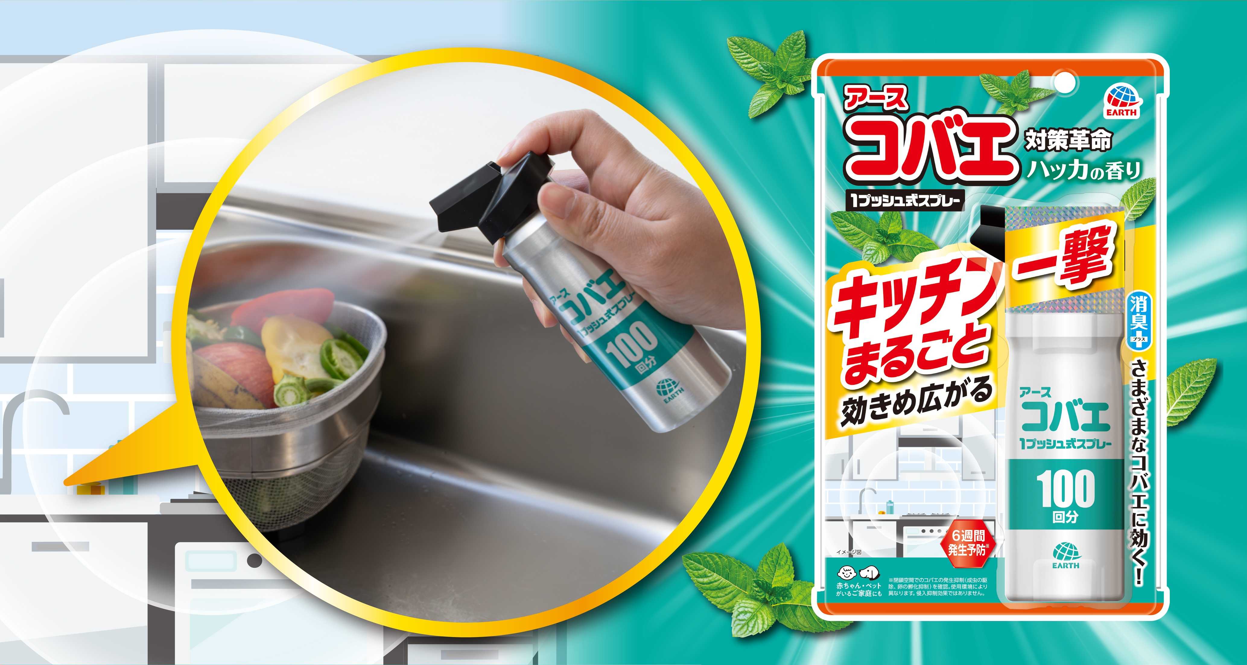 そこで、当社は「キッチンでの使用」に着目し、食品周りにも使いやすい『アースコバエ キッチンまるごと 1プッシュ式スプレー 100回分』を発売いたします。利用シーンを明確にしたラインアップを展開することで、お客様一人ひとりのライフスタイルに合わせた最適なコバエ対策をサポートしてまいります。