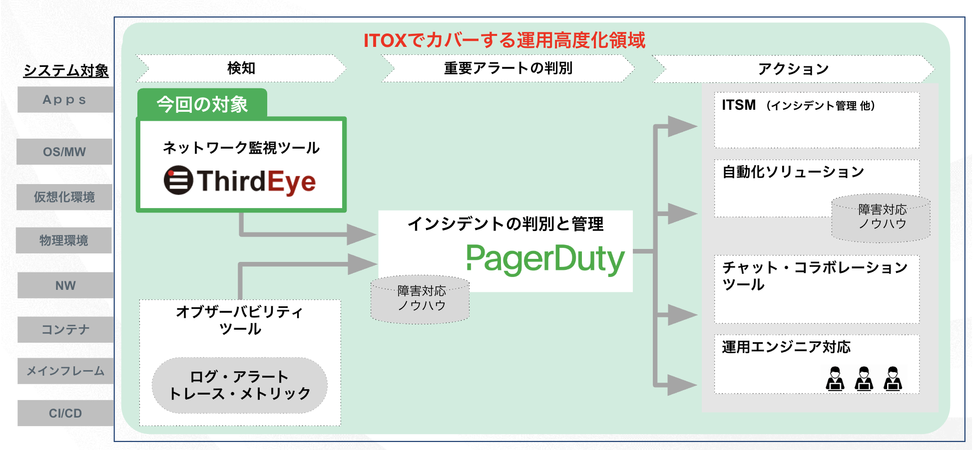 リアルタイムなインシデント対応ソリューションを提供するPagerDuty株式会社(本社:東京都港区、代表取締役社長:山根 伸行、以下:PagerDuty)は、伊藤忠テクノソリューションズ株式会社のグループ会社であるCTCテクノロジー株式会社(本社:東京都港区、代表取締役社長:中谷 寿宏、以下:CTCT)が提供するシステム運用サービス「ITOpsX-formation サービス®(以下:「ITOX」)」において、株式会社ロジックベイン(本社:神奈川県川崎市、代表者:笹岡 隆)のネットワーク監視ツールThirdEyeの新バージョンとの連携が強化されたことを発表します。