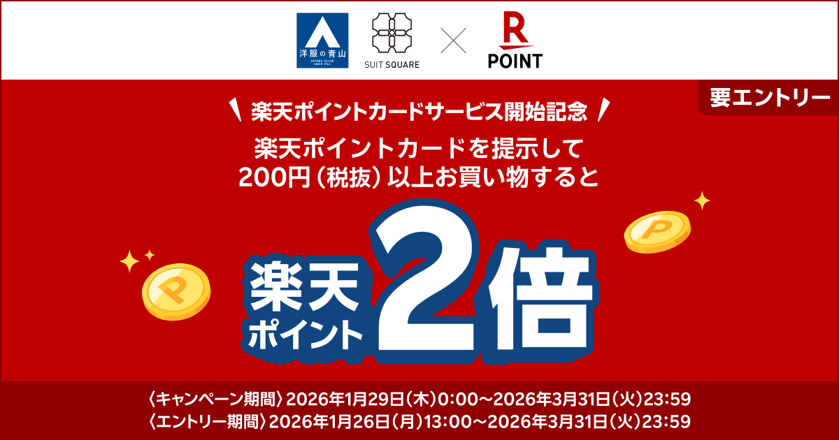 青山商事株式会社(本社:広島県福山市/代表取締役社長:遠藤 泰三)は楽天ペイメント株式会社(以下「楽天ペイメント」)と提携し、全国の「洋服の青山」「SUIT SQUARE」など721店舗※(アウトレット除く)において、2026 年 1 月 29 日(木)より共通ポイントサービス「楽天ポイントカード」が利用可能になります。なお今回の、「楽天ポイントカード」導入を記念し、ポイント2倍キャンペーンも実施します。