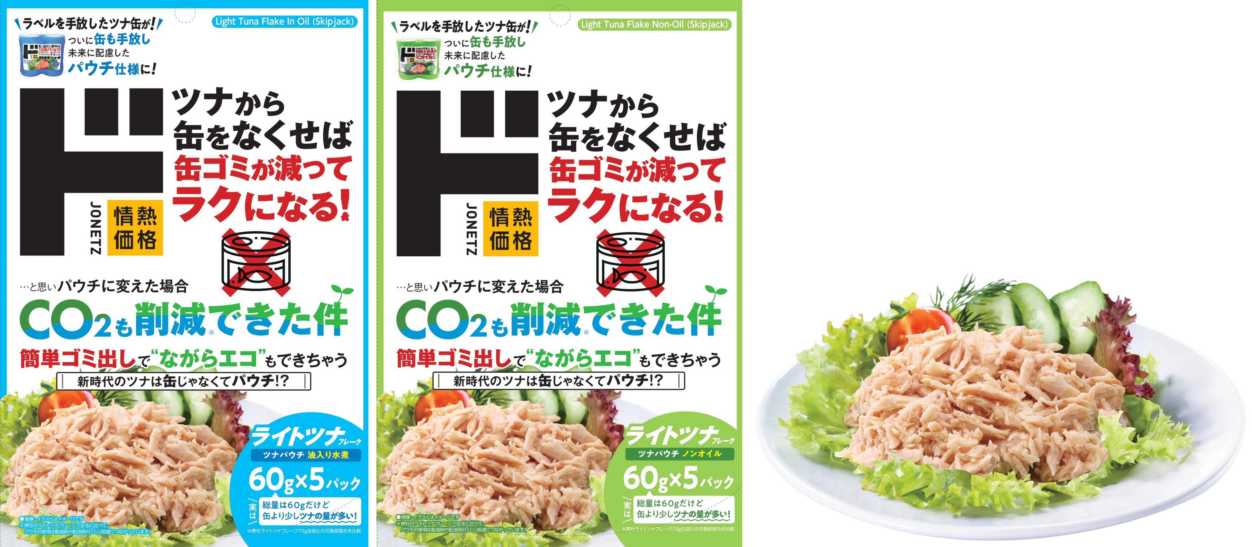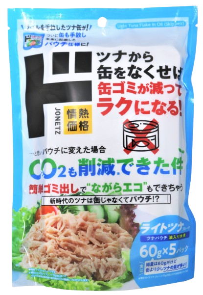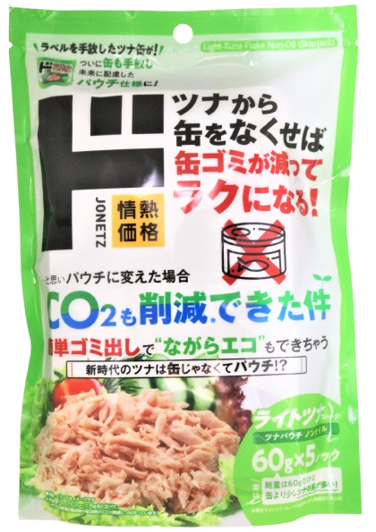 パウチは材質の特徴から、少ないオイルやスープ量でも均等にツナの身に水分を行き渡らせることができます。よって、パウチタイプは液体を最小限に抑えており、1パック60gと総重量は従来の缶タイプ(70g)より少なく見えますが、可食部分(ツナの身)の重量は缶タイプよりも少し多く※、よりお得な内容量となっています。