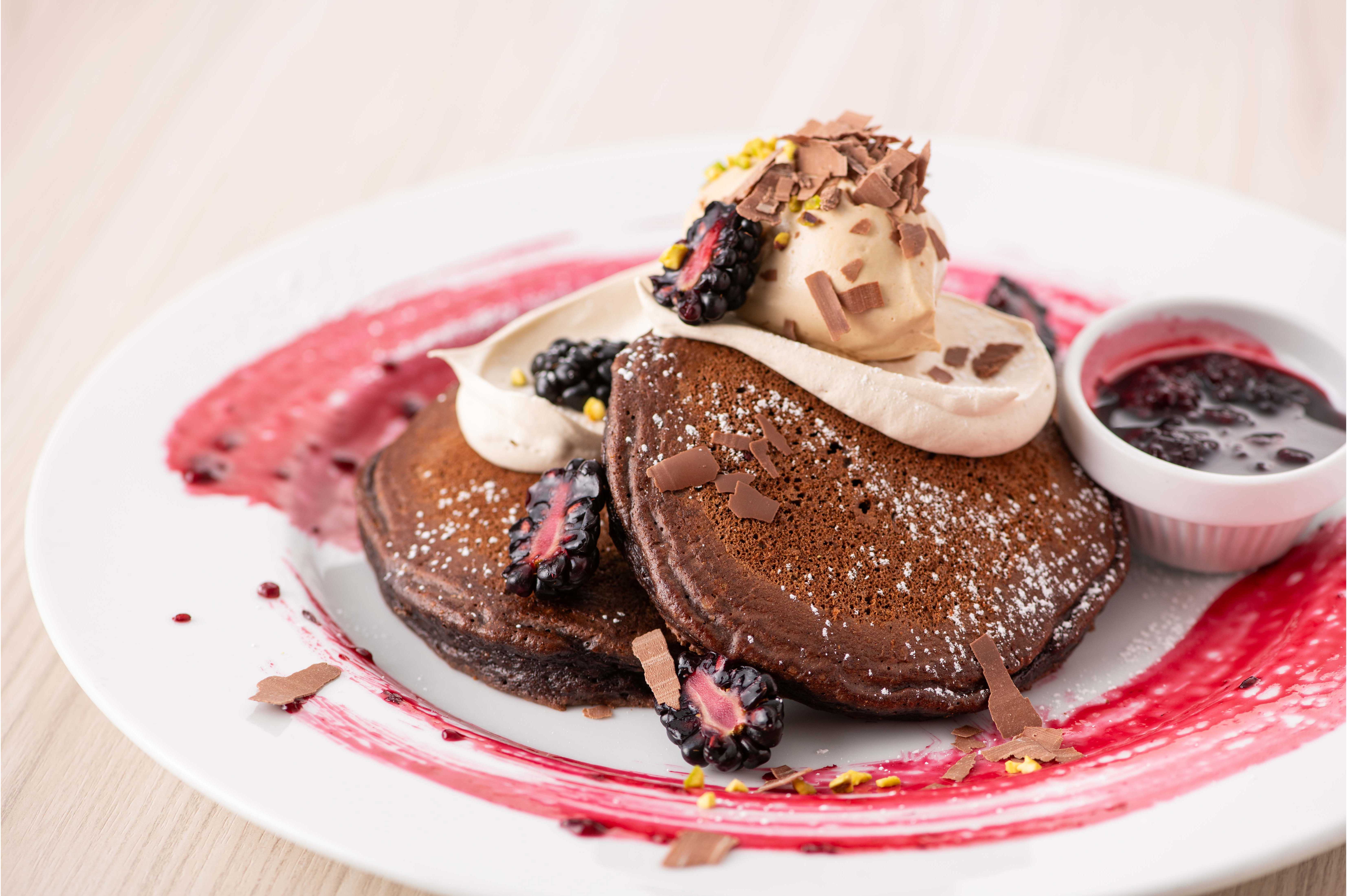 「モカパンケーキ with コーヒーマスカルポーネホイップ」は、ヴァローナのココアパウダーを生地に加えた、優しくコーヒー香るふわふわモカパンケーキに、マスカルポーネホイップ、ブラックベリーソースをたっぷりかけたパンケーキ。パンケーキとマスカルポーネホイップを一緒にお召し上がりいただくと、まるでティラミスのような味わいに。口の中でシュワっと溶ける、サクサクのメレンゲと一緒にお召し上がりください。