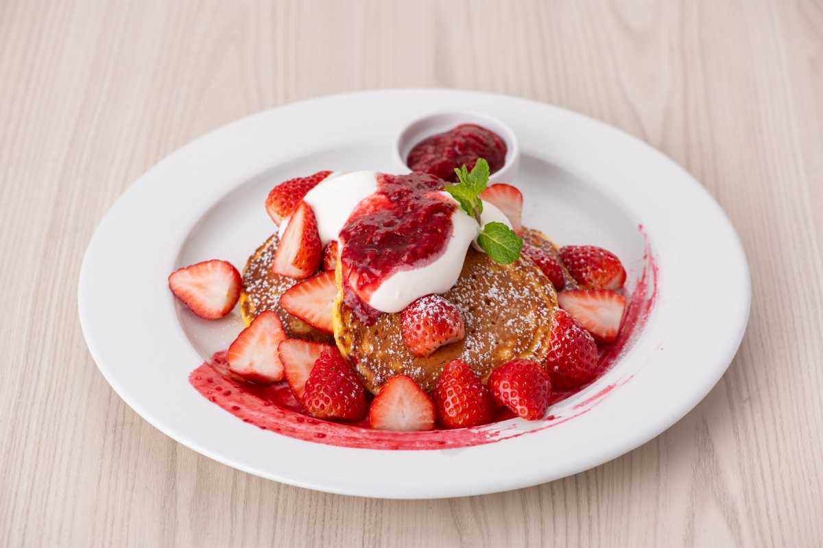 「ベリーストロベリーパンケーキ」は、ふわふわのバターミルクパンケーキに、フレッシュストロベリーと果実感たっぷりの自家製ストロベリーソースを贅沢にトッピングした期間限定スペシャルメニュー。
