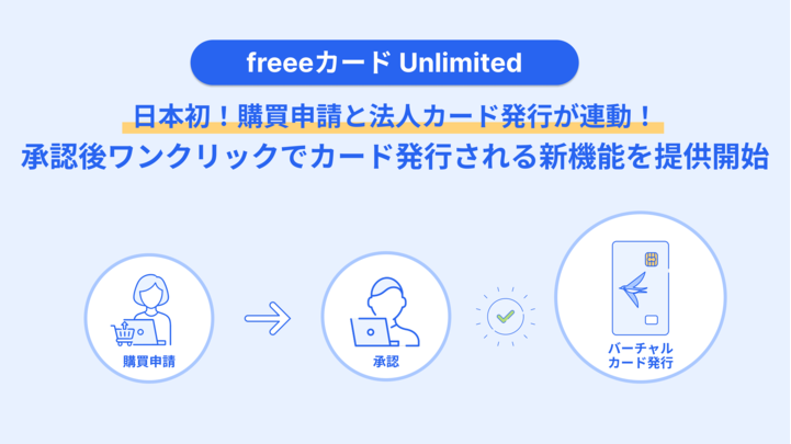 フリー株式会社(本社:東京都品川区、CEO:佐々木大輔、以下「freee」)は、法人向けコーポレートカード「freeeカード Unlimited」において、「購買申請連携機能」を提供開始しました。本機能は、購買申請フローの中でバーチャルカードの発行を完結できる日本初の機能(※1)です。