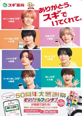 スギ薬局50周年を記念し、2月2日(月)9時から なにわ男子とのコラボキャンペーン「50周年大感謝祭」を実施いたします。期間中、スギ薬局の対象店舗にて商品をご購入のうえ、スギ薬局アプリからキャンペーンにご応募いただいた方の中から、抽選で合計3,000名様にスギ薬局オリジナルフォンタブをプレゼントいたします。
