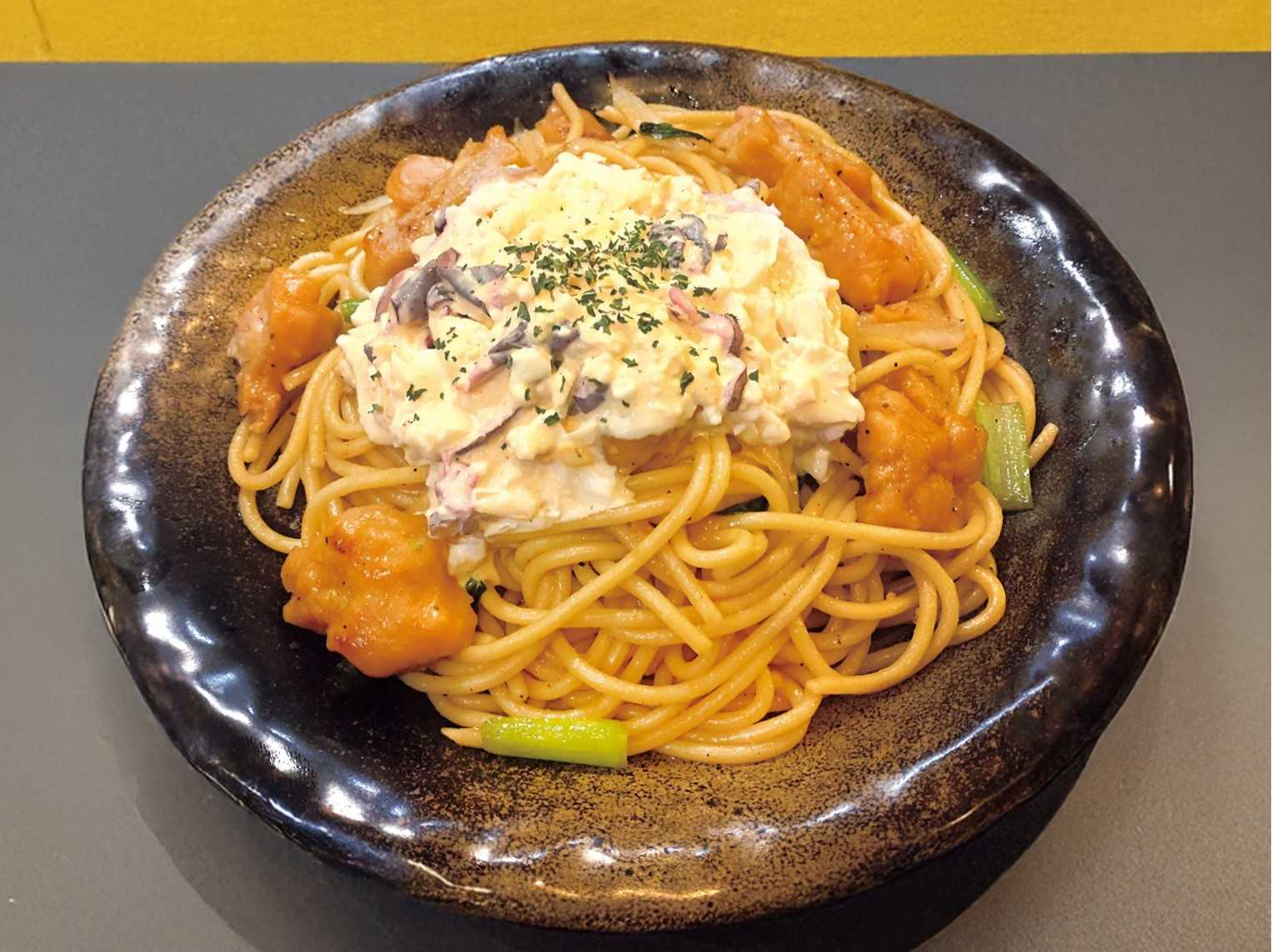 「チキン南蛮風焼きスパ」は、鶏のから揚げ、タマネギ、小松菜とともに炒めたモチモチ食感のスパゲティに、甘酸っぱくてコクのある特製の南蛮ソースを絡め、仕上げにしば漬け入りのタルタルソースをトッピングした一品。南蛮の甘さを、しば漬けの酸味が締め、重さが旨さに変わる「エンドレスに旨い」一皿に仕上げました。