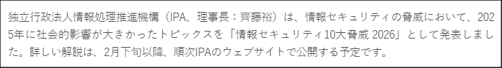 「情報セキュリティ10大脅威 2026」の詳しい解説は、2月下旬以降、順次IPAのウェブサイトで公開する予定です。