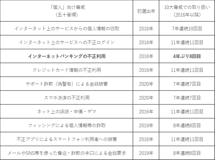 一方、「個人」向け脅威(注釈1)では、「インターネットバンキングの不正利用」が2023年以降、圏外となっていましたが、4年ぶりに2026年で復活しました。昨今の被害の状況を踏まえた結果と考えられます。