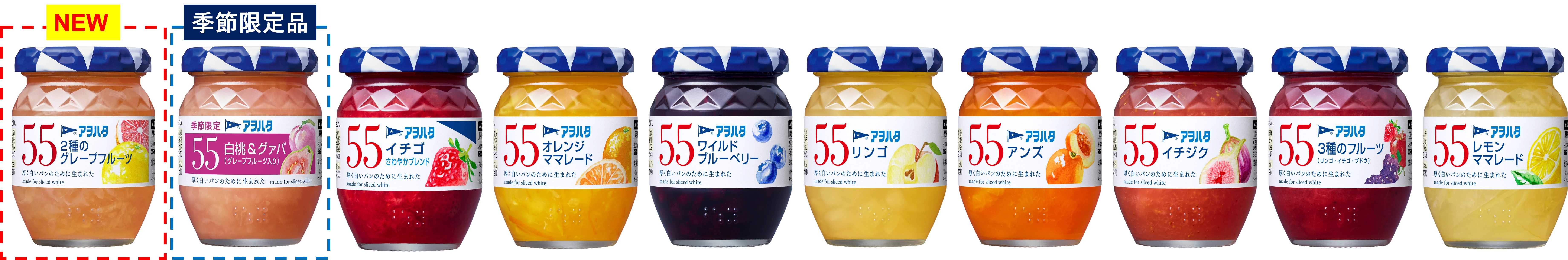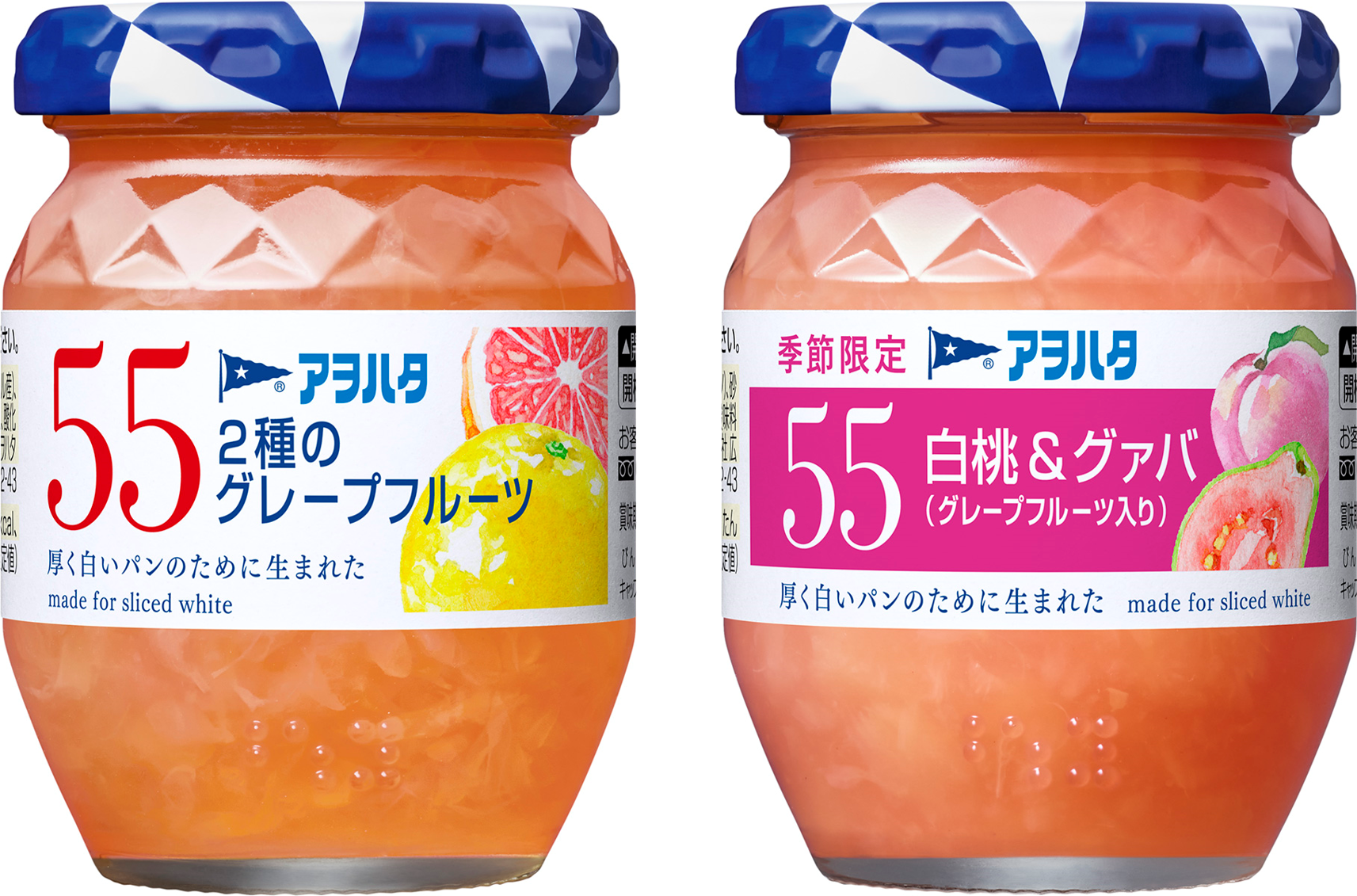 「アヲハタ 55」シリーズは、1970年の発売以来パンの最高の相棒をめざして進化を続けています。今回は、さわやかな柑橘系のフレーバーが人気であることから、新たなラインアップとして「2種のグレープフルーツ」が誕生しました。また人気のフルーツを組み合わせた「白桃&グァバ(グレープフルーツ入り)」を季節限定品として発売します。