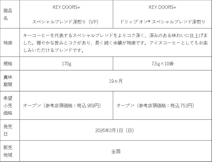 これらの背景から、2026年もより多くの生活者にアイスコーヒーをお楽しみいただけるよう、『KEY DOORS+ スペシャルブレンド深煎り』(「中容量帯粉VP」および「簡易抽出型ドリップ オン®」)をアイスコーヒーの活用を訴求した数量限定パッケージで展開するとともに、『KEY カフェオレベース 無糖』をリニューアル。アイスコーヒーを通じて生活者とのコミュニケーション促進を図ります。