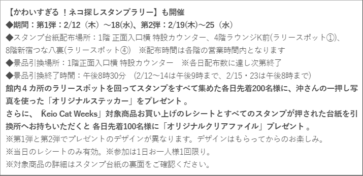 京王百貨店 新宿店では、2月12日(木)~25日(水)の期間、対象売場にて「Keio Cat Weeks」を開催します。全国各地で猫好きの方に向けたイベントや展覧会などが開催される2月22日の“猫の日”。