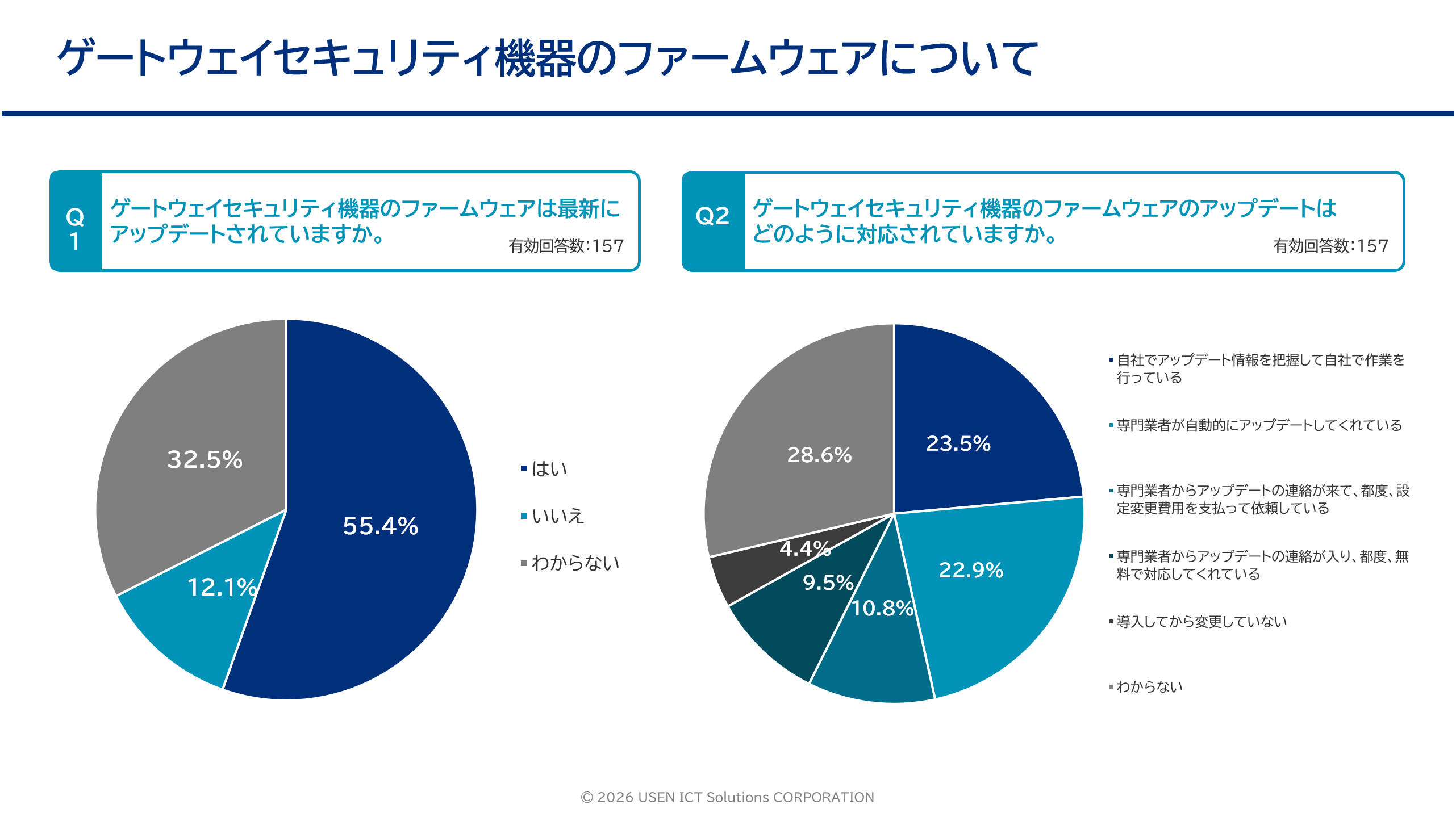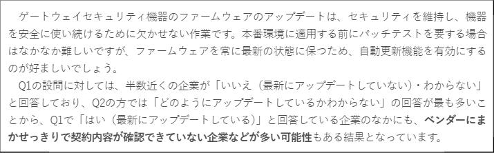 また、既存のセキュリティ機器の運用状況についても、約半数の企業がファームウェアの更新状況を「把握していない」または「更新していない」と回答しました。対策を導入していても、その後の運用・管理が十分に行われていないケースが少なくないことがうかがえます。