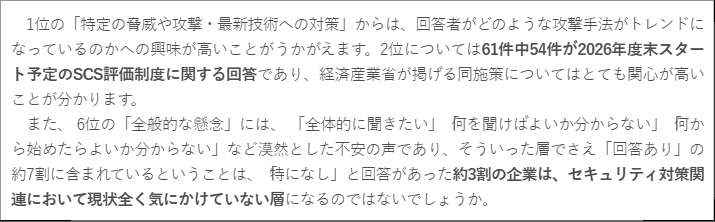 一方で、SCS評価制度という国の取り組みに対して、現場の担当者の関心自体は高いことも本調査から確認されました。その反面、具体的に何から着手すべきか分からない、優先順位を付けられないといった声も多く、制度対応に向けた実務面でのハードルが存在していることが推察されます。