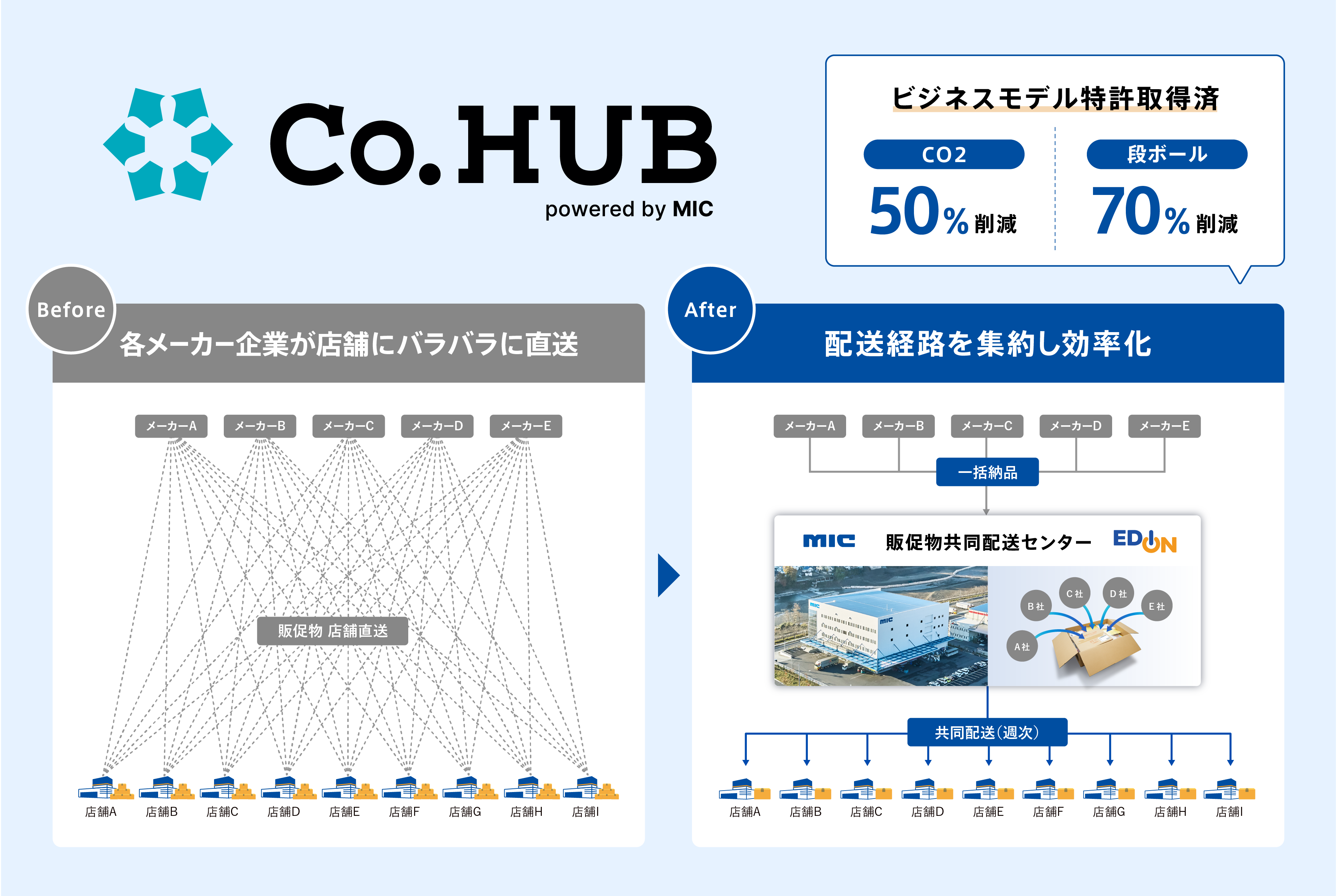 株式会社エディオンは、2026年4月より、店舗運営の業務効率化、ならびにお取引先様の物流負荷軽減と環境負荷低減を目的として、MIC株式会社(本社:東京都新宿区、代表取締役会長:水上 光啓 / 代表取締役社長 社長執行役員:河合 克也、以下「MIC」)が提供する販促物共同配送プラットフォーム「Co.HUB(コハブ)」および、店舗販促物オーダーシステム「Promo Store(プロモストア)」を導入することといたしました。家電量販店業界として初の試み※1となる本取組みを通じ、お取引先様と共に持続可能な物流モデルの構築を目指してまいります。