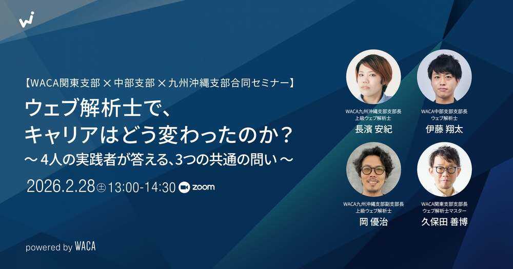 一般社団法人ウェブ解析士協会(WACA)は2026年2月28日(土)、ウェブ解析士の資格をキャリアにどう活用するか知りたい方のためのオンラインセミナー「ウェブ解析士で、キャリアはどう変わったのか?」を開催します。「これからのキャリアをどう描けばいいのか迷っている」「勤め先以外でも自分のスキルを試す場が欲しい」「ウェブ解析士の資格を取ったけれど、どう生かせばいいのかわからない」「法人会員で、義務的に資格を取得したけれど実務で活用できていない」そんな悩みをお持ちの方にヒントをお送りします。