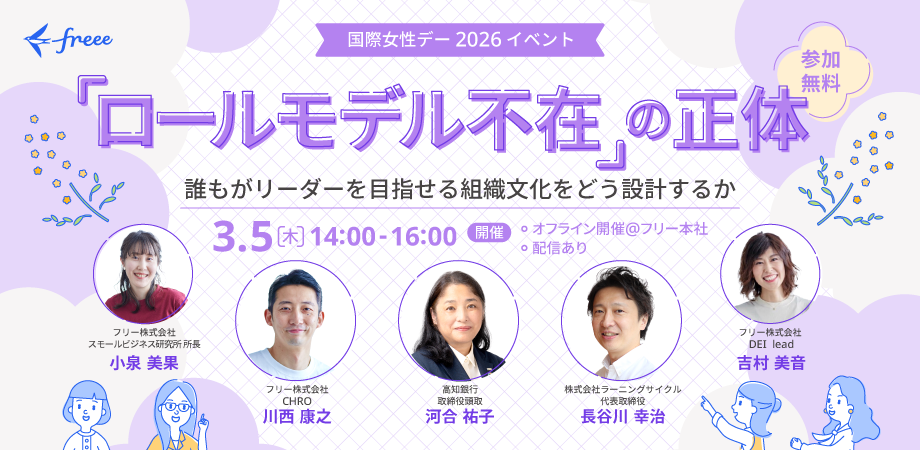2026年のfreeeの国際女性デーイベントでは、このような状況を打破し、誰もが自然体でリーダーを目指せる組織文化をどう設計すべきかを議論するイベントを開催します。イベントでは、地方金融の最前線で経営に向き合う高知銀行取締役頭取 河合祐子 氏に登壇いただき、スモールビジネスの変革を支援するfreeeとともにデータに基づいた現状分析から具体的な組織設計のヒントまでをお届けします。