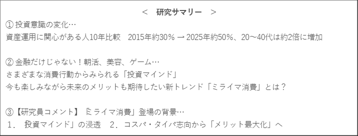 1.「投資マインド」の浸透 2.コスパ・タイパ志向から「メリット最大化」へ