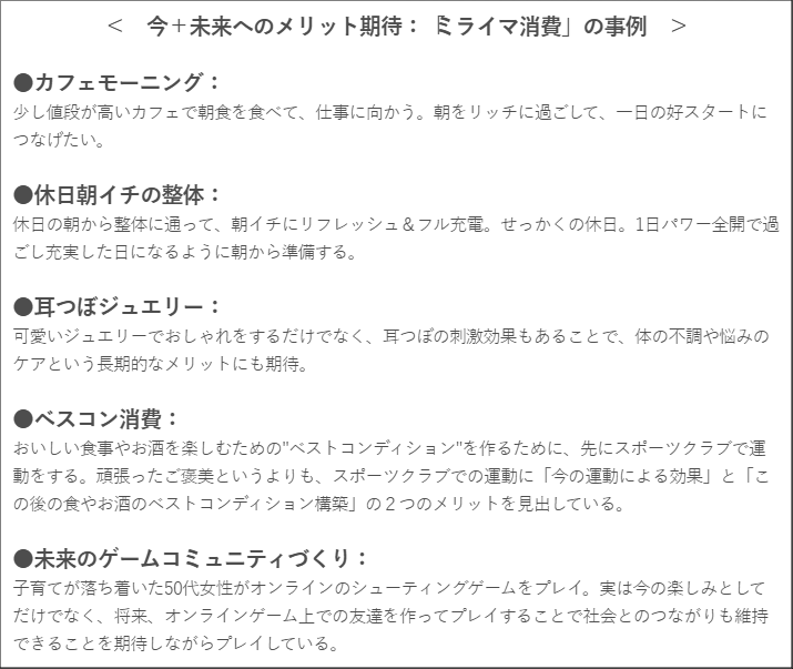 ひと研究所では、この投資意識の浸透が金融以外の対象にも表れている兆しを捉えました。なかでも、商品やサービスを消費する際に、今得られるメリット(おいしい、おしゃれなど)と同時に未来に期待できるメリット(頑張りが継続できる、長期的に美容効果が期待できるなど)も考慮する傾向に着目。この消費の傾向を“未来+今”で「ミライマ消費」と名付けました。定性的な生活者実態調査などを通じて確認した、ミライマ消費の事例を一部ご紹介します。