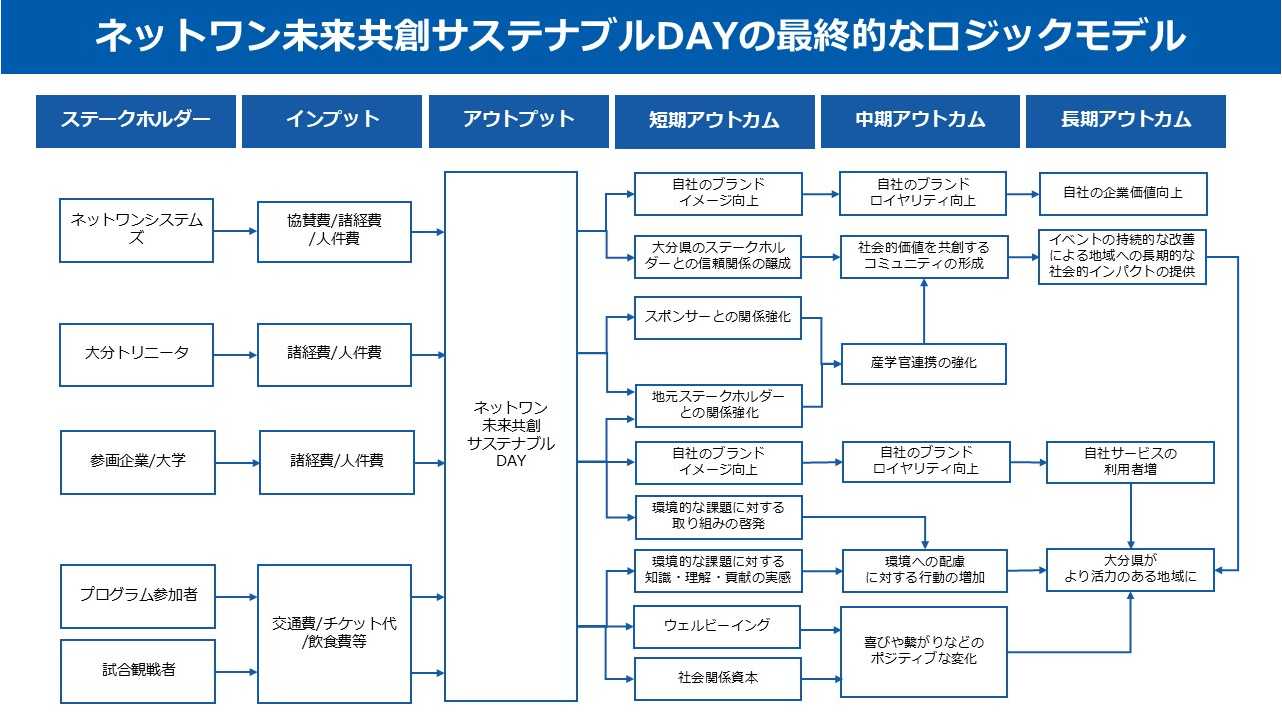 ネットワンシステムズ株式会社(本社:東京都千代田区、代表取締役 社長執行役員:竹下 隆史)は、Jリーグクラブ・大分トリニータを中心に産官学団体が連携して推進する「サステナビリティ共創プロジェクト」の一環として実施した地域共創イベントにおいて、社会的投資収益率(Social Return On Investment、以下 「SROI」)による成果測定を行いました。