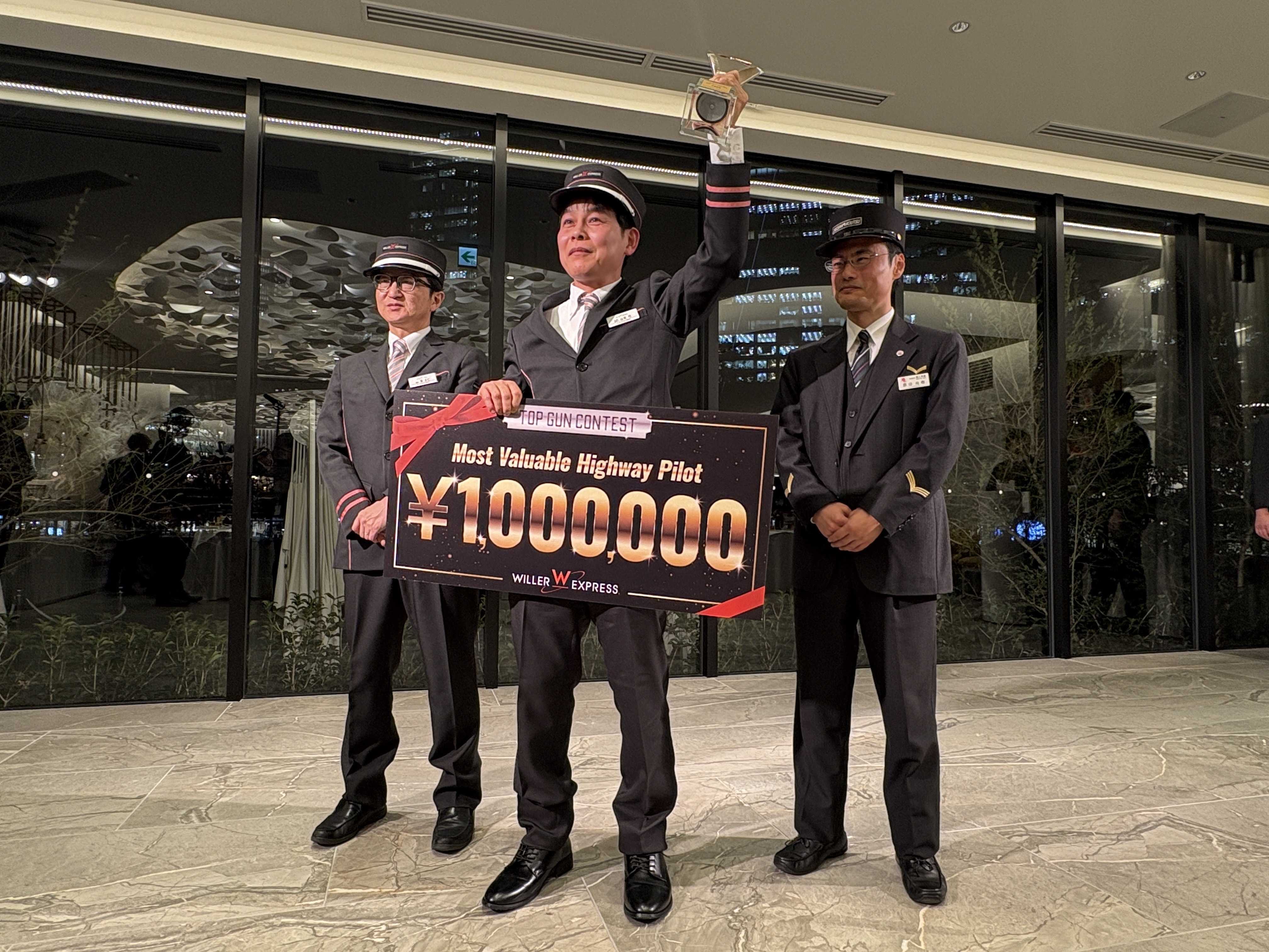 一次審査と二次審査の結果、2025年の“トップガン”に輝いたのは、ウィラーエクスプレス東京営業所所属、ハイウェイパイロット歴8年目の山本巧(やまもと さとし・48歳)さんでした。審査員からは、冷静で丁寧な対応や、お客様一人ひとりへの配慮が特に高く評価され、見事に“トップガン”の栄冠を手にしました。会場からは大きな拍手が送られ、優勝トロフィーとともに賞金100万円が授与されました。
