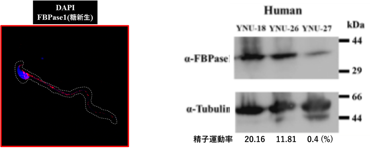 そこで本研究では、哺乳類(ウマ・ウシ・マウス・ヒト)の精子運動において、電子伝達系で得られたエネルギーを使ってグルコースを合成する「糖新生」が起こり、そのグルコースを鞭毛に運んで解糖系を利用して活発な運動に必要なエネルギーを作っているのではないか、という仮説を立てました。この仮説を検証するため、糖新生に必要な酵素であるフルクトースビスフォスファターゼ(FBPase1)に着目し、男性不妊患者の精子におけるFBPase1のタンパク質発現および局在プロファイルを解析することで、実際に精子内で糖新生が生じているかを検討しました。