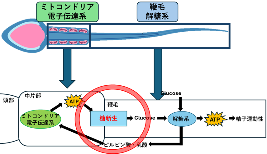 本研究グループはウマ、ウシ、マウスおよびヒトの精子はミトコンドリア*1で作られたエネルギーで糖を合成し、それを用いて自らの運動に必要なエネルギーを産生していることを世界で初めて明らかにした。