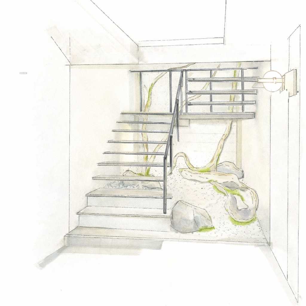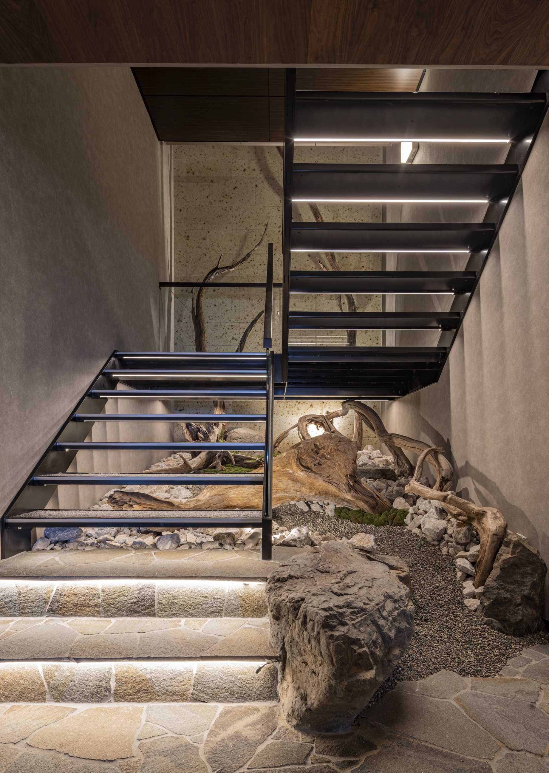 階段は、正面から奥へ向かって徐々にレベルを高くし、奥まで緑がよく見えるようにしました。1階から2階へ促すように、4mを超える背の高い流木を配置し、その手前に石を添えています。これにより、2階からも流木の存在を感じられる立体的な演出となっています。