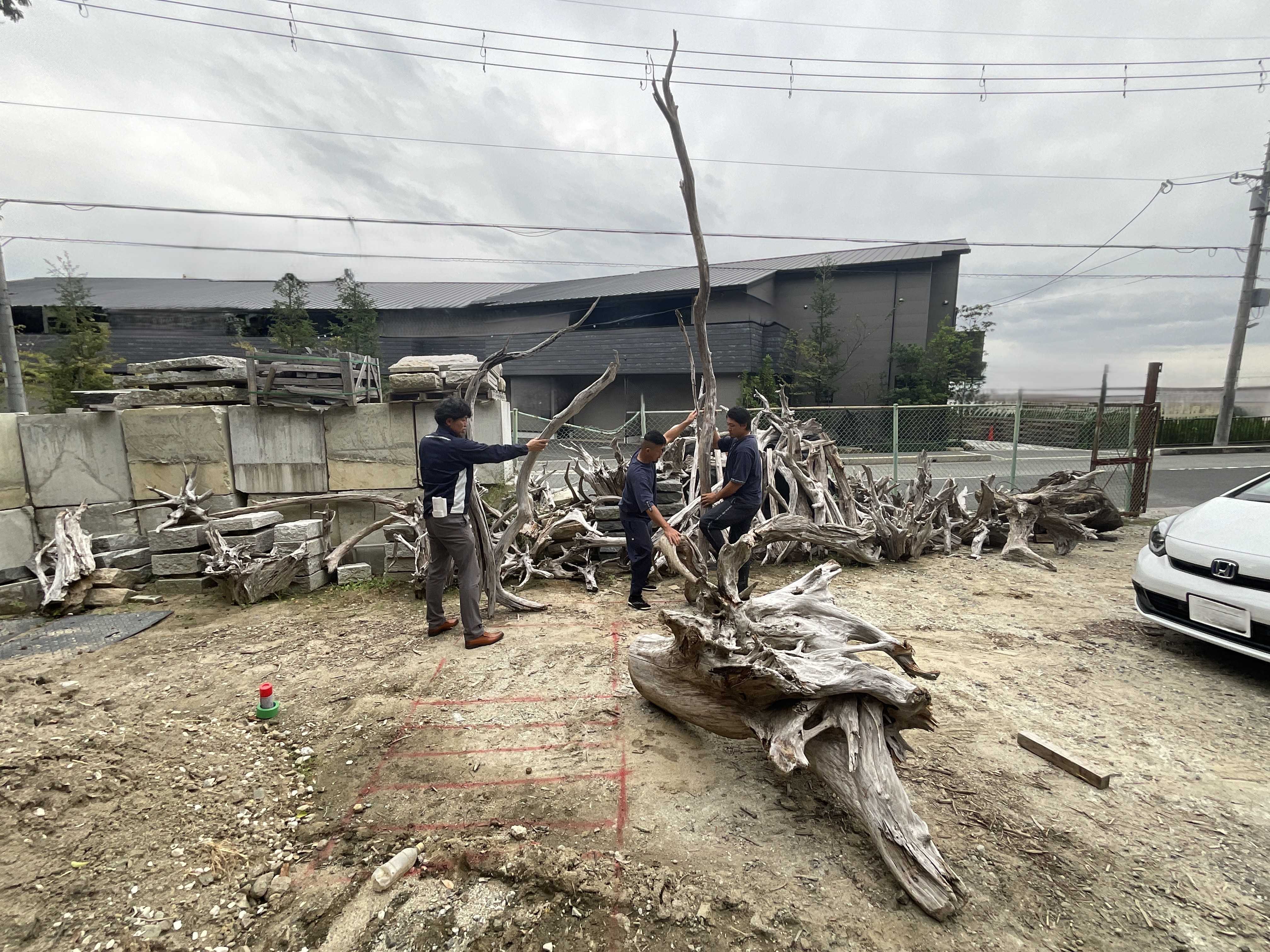 齋藤は今回の設計を次にように振り返ります。「K様から、『月日が経過しても美しく、長く愛され、年月を重ねて美しくなるようにして欲しい “エイジング”を意識して欲しい』というお話を伺い、コンセプトを“エイジング”にしました。完成した瞬間がピークではなく、年月を重ねるほどに魅力が増す空間です」。K様は当初、敷地いっぱいに建物を配置したため、造園スペースが少ないことがマイナスと考えておられました。しかし、齋藤は、あえてその制約を強みに変えた提案をしたのです。「スペースが限られているからこそ、大きな石や流木を使えば、逆に迫力が生まれます。思い切ってダイナミックな造園にしましょう。」このご提案に、K様は快くご承諾をしてくださいました。