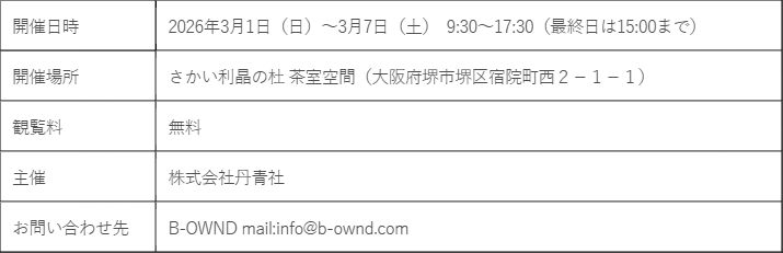 本取組により、B-OWNDが推進する現代のアート工芸に茶の湯とその聖地である堺市の歴史的な文化資源を掛け合わせ、新たな価値の創出と海外への発信可能性を探ってまいります。